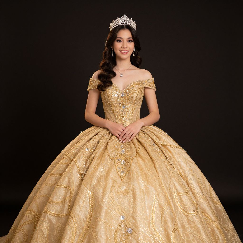 Photograph of a young woman with long, wavy, dark brown hair, wearing a sparkling silver tiara. She has a light skin tone and a warm smile. She is dressed in an off-the-shoulder, golden ball gown adorned with intricate, shimmering embroidery and floral patterns. The gown has a full, voluminous skirt. She is also wearing matching golden earrings and a delicate necklace. The background is solid black, which contrasts with her golden dress, making her the focal point. Her hands are gently clasped in front of her. The overall style is elegant and regal.