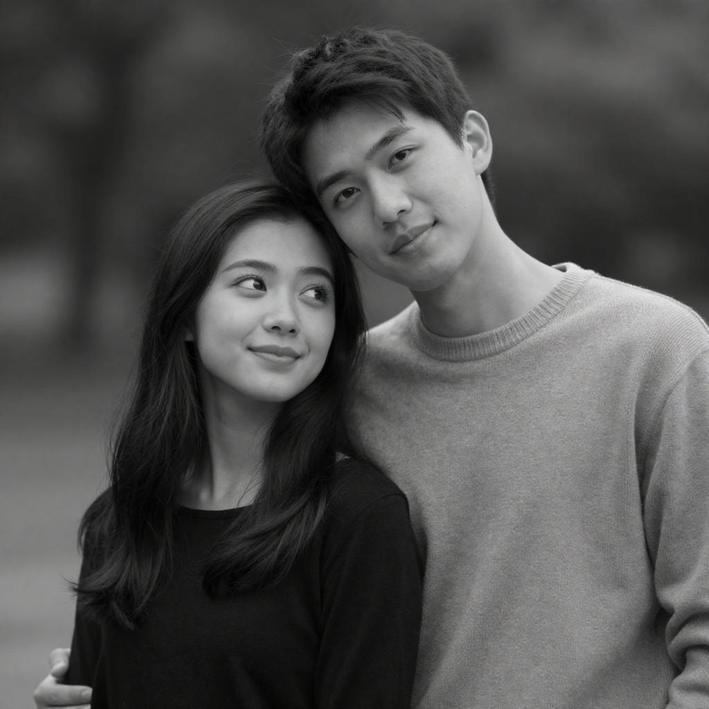 Black-and-white photograph of a young couple facing each other, with the man on the left wearing a dark, high-collared jacket with a circular shoulder strap, and the woman on the right in a dark, patterned jacket. They are close, with the man gently holding the woman's hands. The background is dark and blurred, emphasizing their intimate connection.