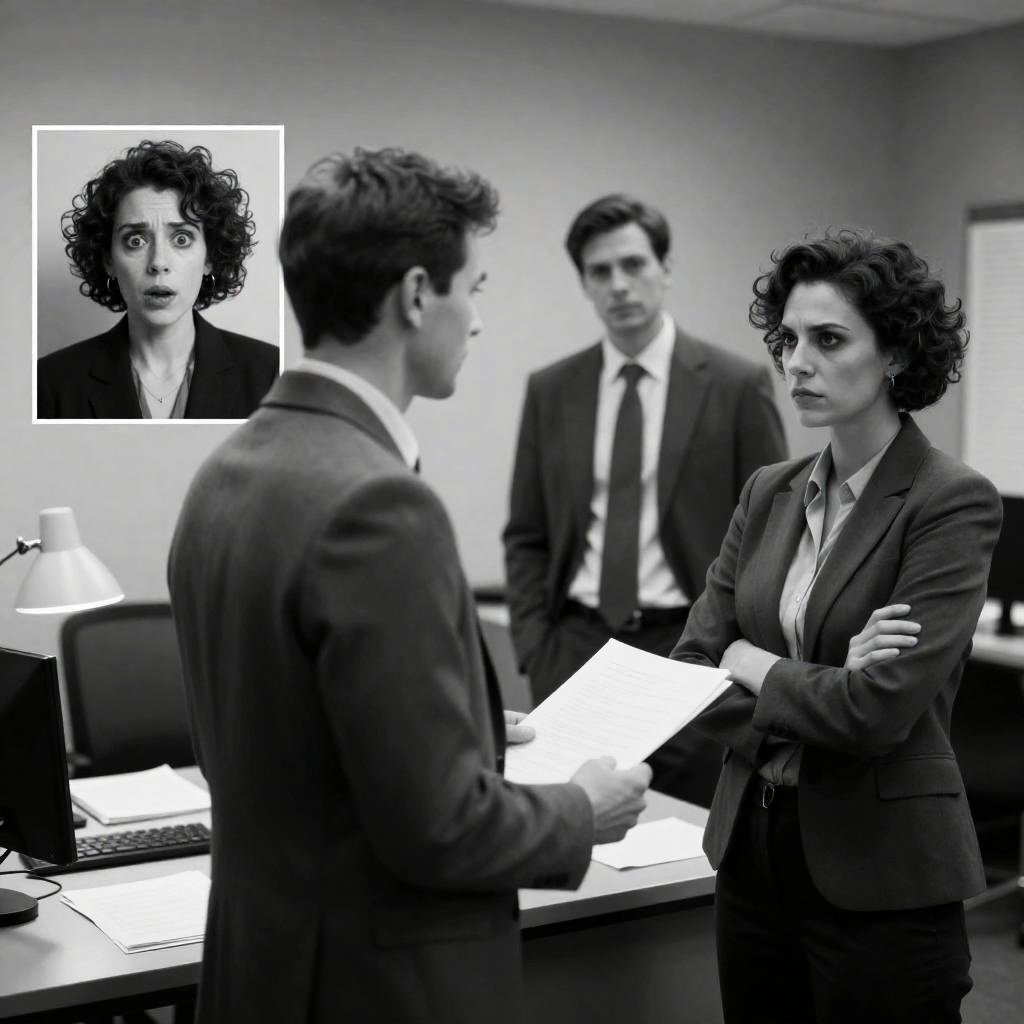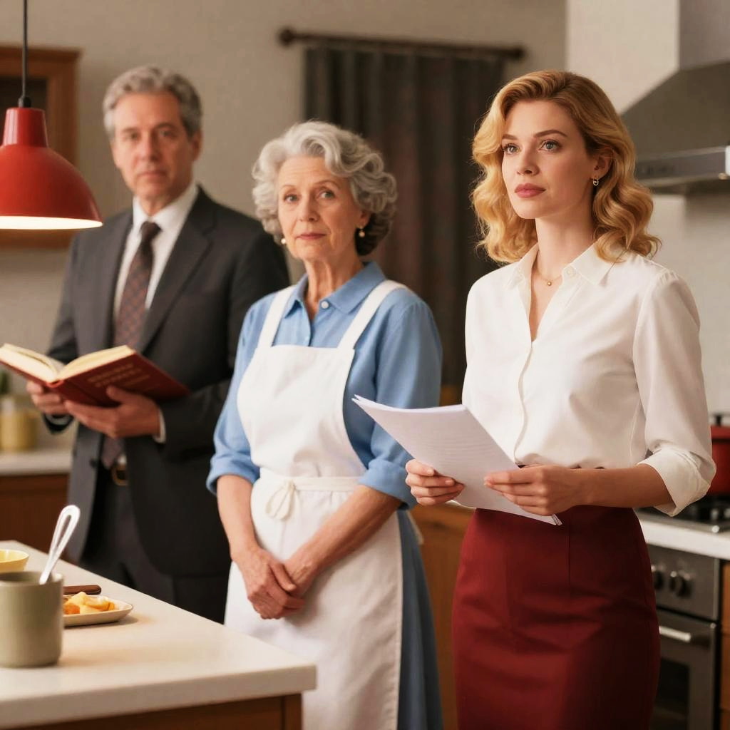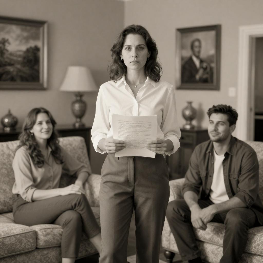 Sepia photograph of three people in a living room. Center woman stands with papers, serious expression. Left woman sits on couch, relaxed, smiling. Right man sits, looks at center woman, slight smile. Framed paintings, lamp, and furniture in background.