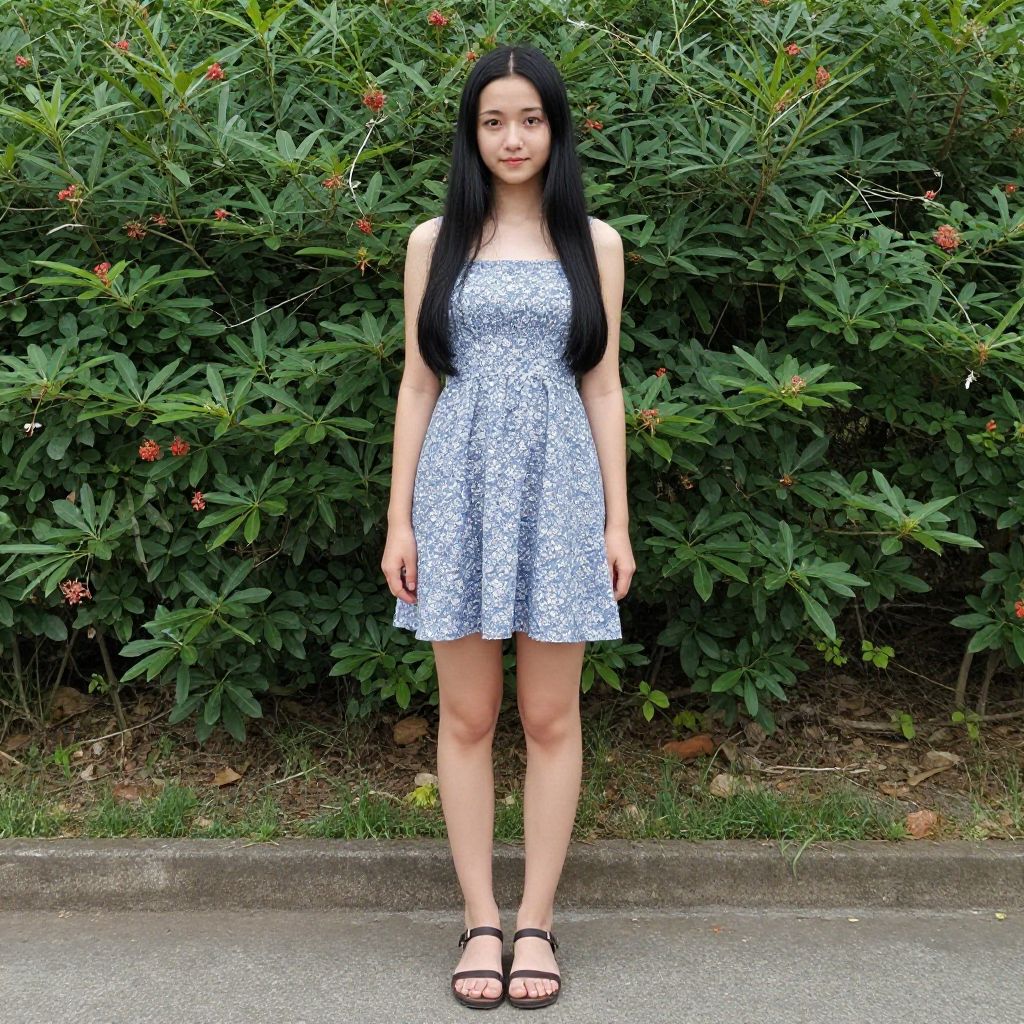 Photograph of an Asian woman with long, straight black hair and fair skin, standing outdoors on a paved path. She wears a sleeveless, blue and white floral dress that falls mid-thigh, and black sandals. Her expression is neutral, and she stands with her hands by her sides. Behind her is a dense, green bush with small red flowers. The background is a mix of greenery and a concrete edge. The image has a bright, natural light, highlighting her and the greenery.