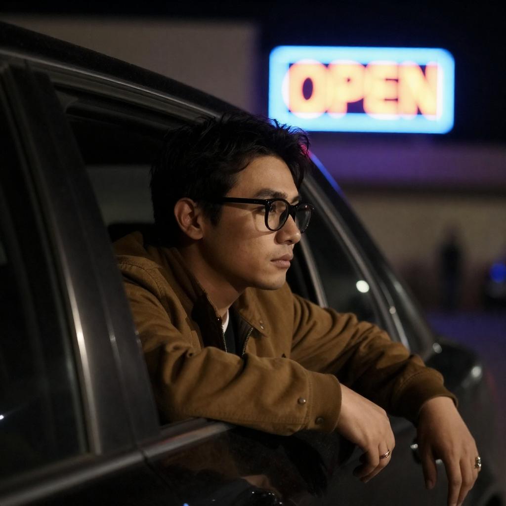 Photograph of a man with dark hair and glasses, leaning out of a car window at night. He wears a brown jacket and a ring on his right hand. A neon "OPEN" sign glows brightly in the background, partially blurred. The car's interior is dimly lit, highlighting his contemplative expression.