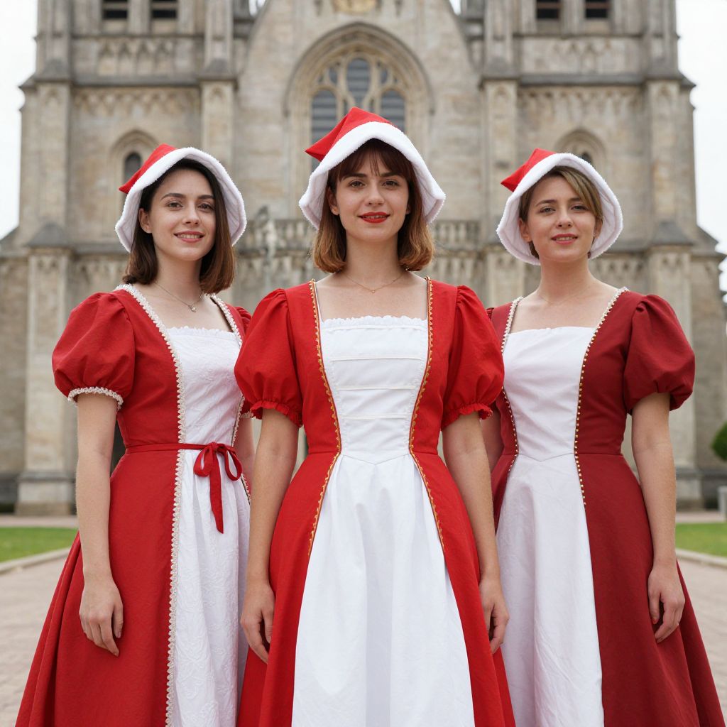 Photograph of three young women standing in front of a Gothic-style cathedral. They wear festive red and white dresses with puffed sleeves, white aprons, and red Santa hats. The central woman has auburn hair and red lipstick, smiling directly at the camera, while the women on the left and right have brown and blonde hair respectively, smiling slightly. The background features intricate stone architecture with arches and a large window. The ground is paved, and there's a green lawn visible to the sides. The overall scene is bright and cheerful.