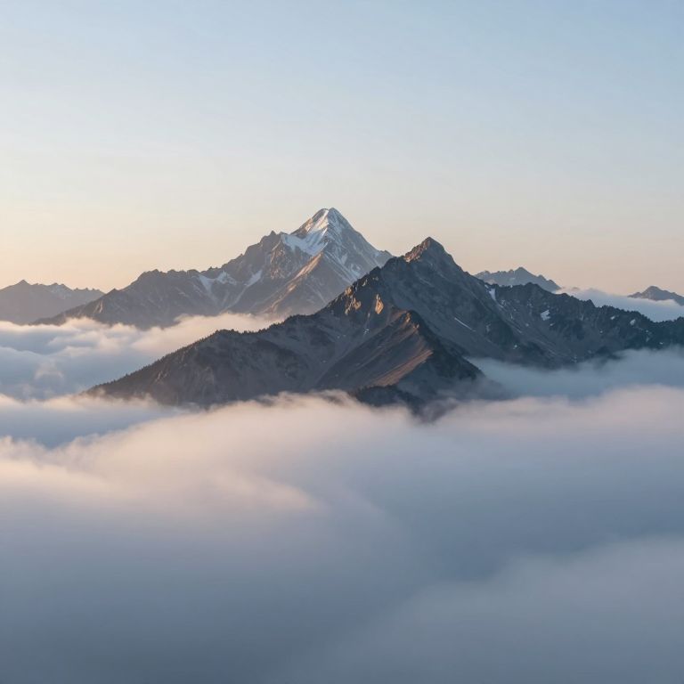 Timeless serenity whispers through the ethereal peaks, where mountains stand as silent sentinels above a sea of clouds, their jagged edges glowing with the promise of transcendence and the quiet majesty of eternal solitude.