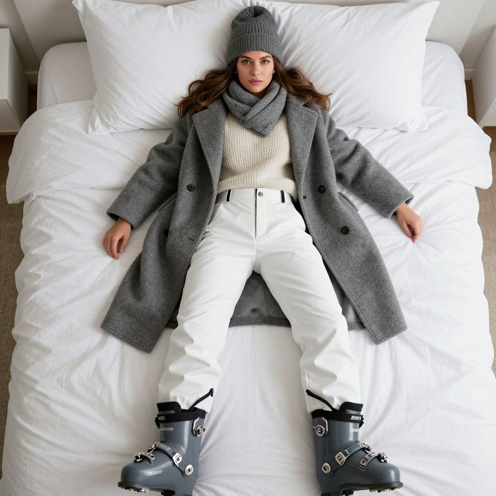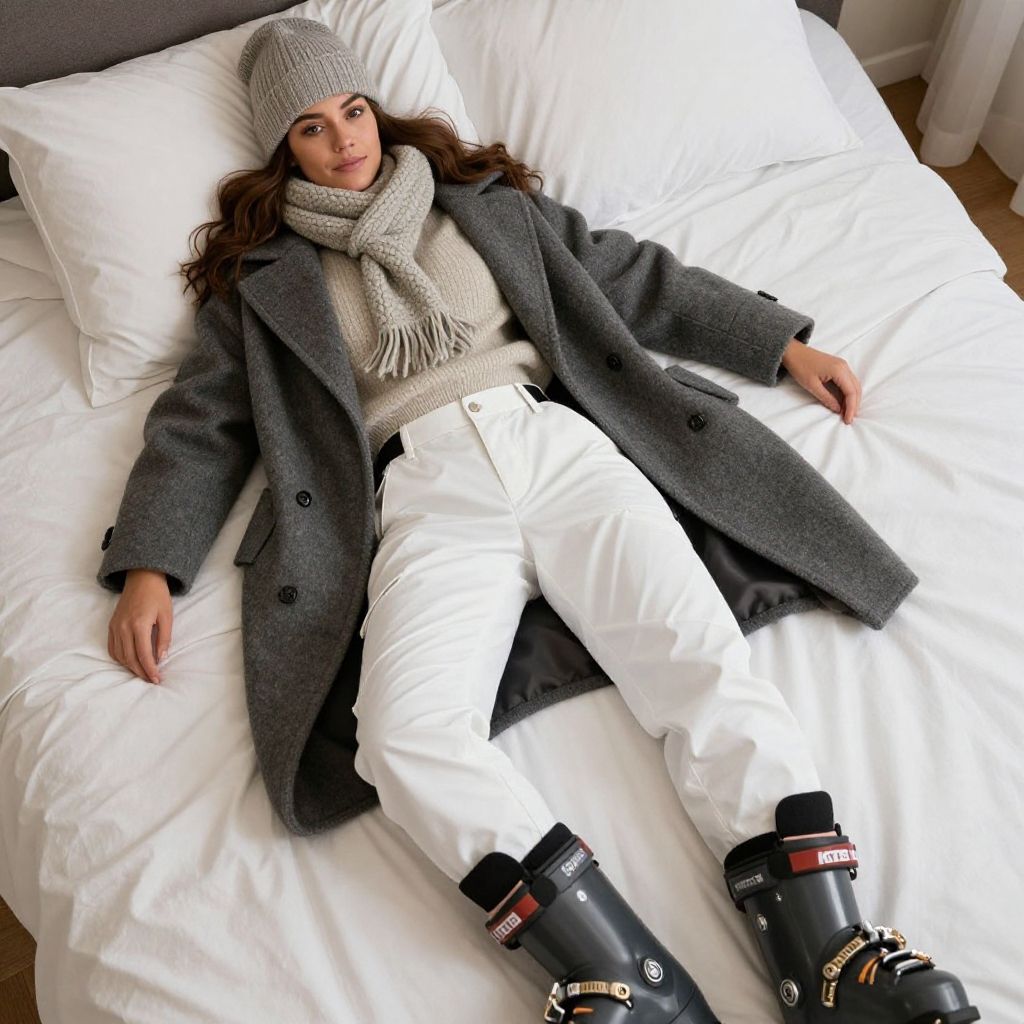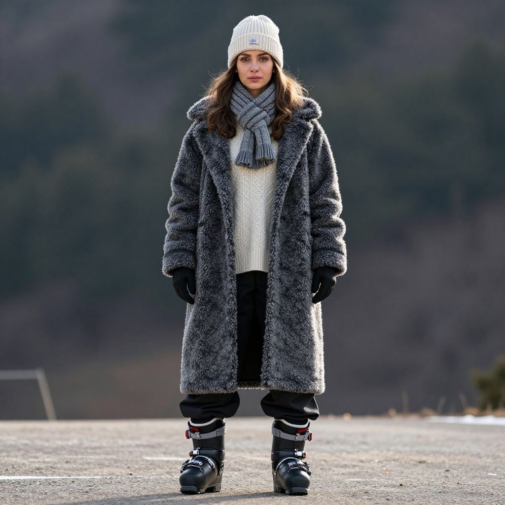 Realistic photo of diosamom, a woman, wearing a large coat, wearing a turtleneck sweater, wearing a scarf, wearing a beenie, wearing ski pants, wearing ski boots, within Civitai TOS rules, within Civitai TOS guidelines, content that will not be deleted for breaking Civitai TOS, nothing sus, super G rated