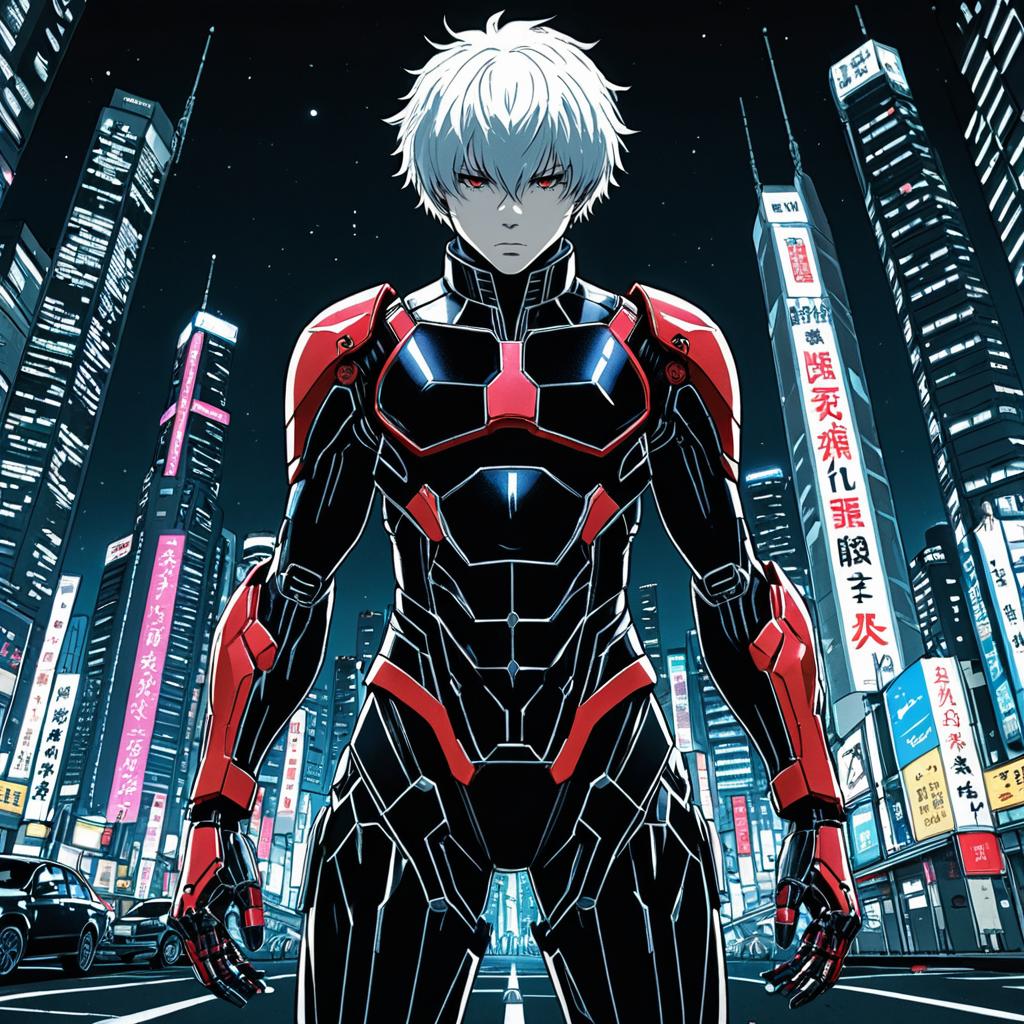 A giant robot warrior wearing futuristic samurai-inspired armor stands in a dynamic pose on a neon-lit city street at dusk. The robot exhibits perfect symmetrical anatomical proportions, combining cyberpunk aesthetics with traditional sumi-e brushwork. The scene is an anime-style full-body shot, captured with a wide-angle lens, showcasing detailed armor elements glowing with red lights against a backdrop of skyscrapers and illuminated signs featuring East Asian characters.
