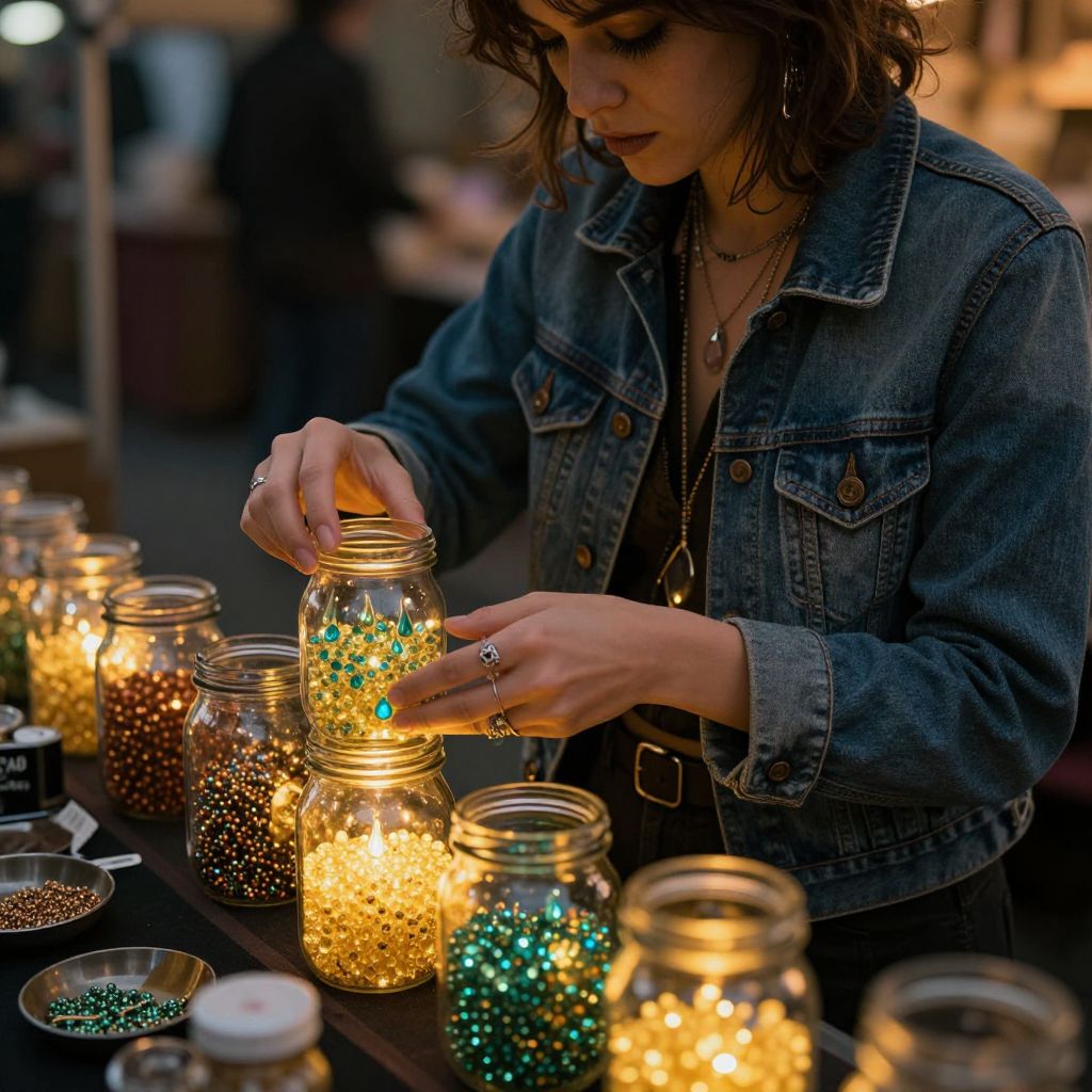 Photograph of a young woman with wavy brown hair and fair skin, wearing a blue denim jacket, focusing intently on filling a glass jar with colorful, glowing beads. She wears a silver necklace and rings. The background is blurred, featuring more jars filled with similar glowing beads in yellow, green, and brown, illuminated by warm, yellow lights. The jars are arranged on a dark wooden table, creating a cozy, artisanal market atmosphere. The woman's expression is concentrated, highlighting her craftsmanship.
