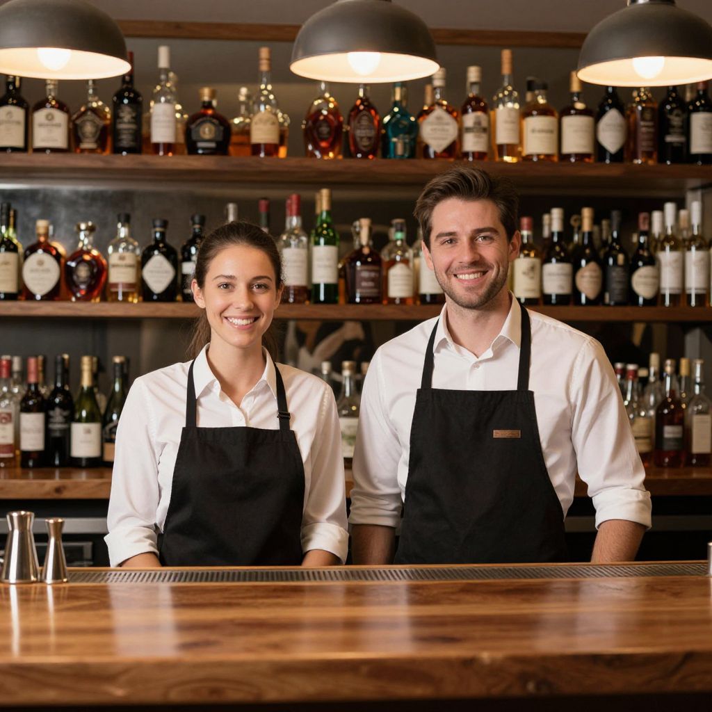 Friendly Bartenders Behind Polished Bar