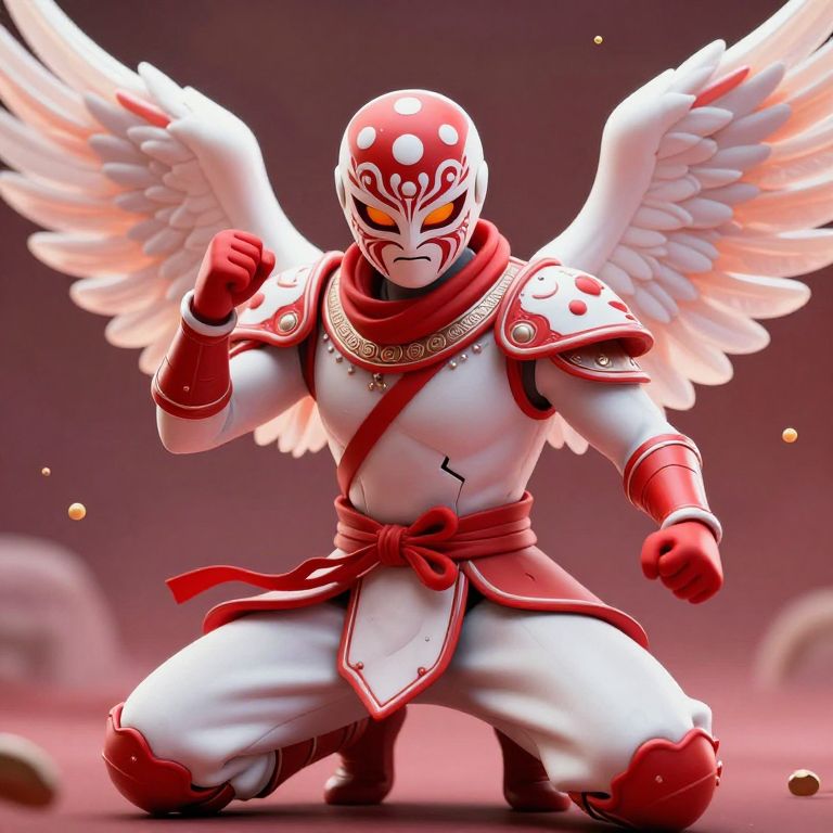 A vibrant digital illustration of a muscular, white-winged warrior in a dynamic pose, crouching with fists raised. The character wears a red and white mask with white and red patterns, red gloves, and a red sash tied around a white, armored outfit with red accents. His large, white wings are spread out, glowing slightly. The background is a gradient of dark red to pink, with floating sparks. The image has a high-contrast, dynamic style with a slightly cartoonish, anime-inspired aesthetic. The warrior's intense expression and powerful stance convey readiness and determination.