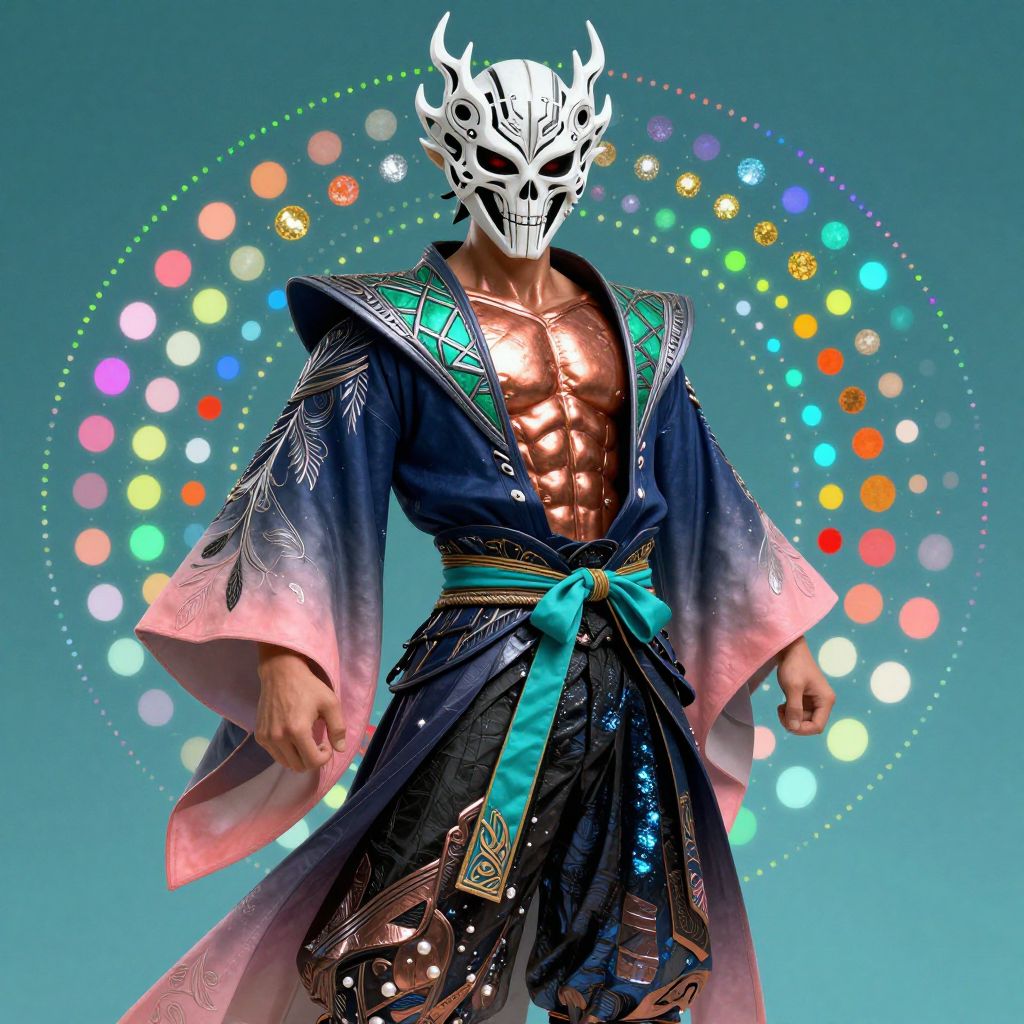Digital art of a muscular, red and white winged ninja in a dynamic pose, fists clenched, with glowing eyes and red mask. Background is