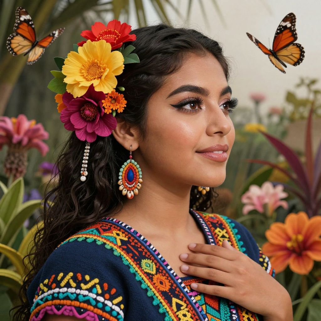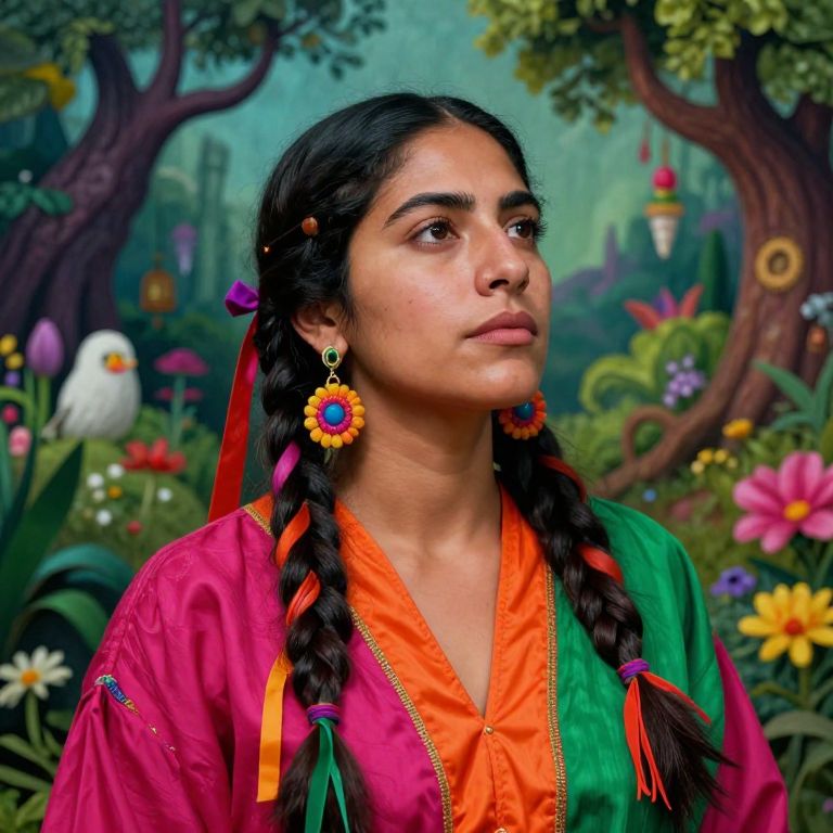 Craft an image embodying the unique self-portrait style of a renowned Mexican artist, showcasing a female figure adorned in robes vibrant with fuchsia, tangerine, and emerald green hues. Capture intricate details from a 'bug's-eye view', highlighting her unibrow, lively hair ribbons, and colorful accessories against a surreal background where traditional folk art seamlessly merges with the mystical allure of an enchanted garden. This composition encapsulates an emotional spectrum ranging from contemplation to elation, reflecting the artist's signature style while celebrating nature's fleeting grace.