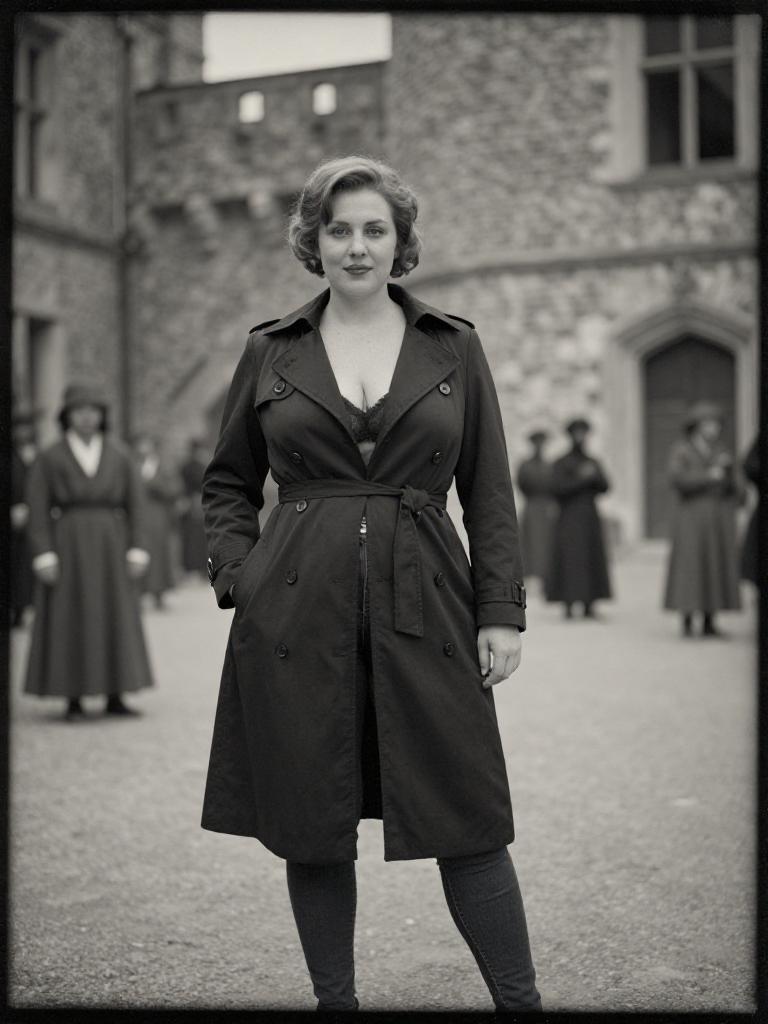 A Curvy woman in a classic black trench coat, mid-thigh length, and dark blue skinny jeans, captured in the visual style of daguerreotype film, standing in a castle courtyard with historical reenactment. Sexy. Pretty face and beаutiful eyes. Big breasts