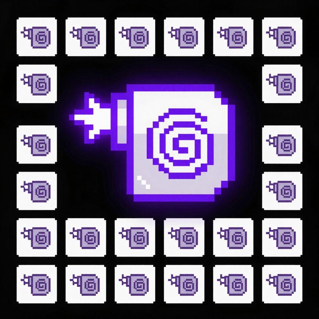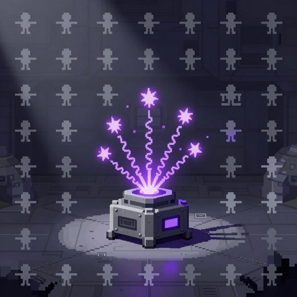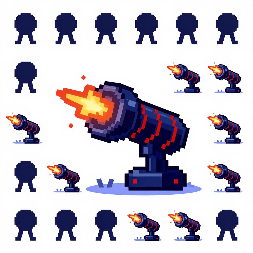 Compact pulse projector sprite, minimalist pixel art, pearl white with glowing royal purple patterns, glowing coils, animated sparks and muzzle flashes, compact modular base positioned in high-tech command center, crisp silhouette and outline clusters, limited 8-10 color range, 32x32 or 48x48 frame size, clean dithering, pixel-perfect shading, high contrast readability, HUD-safe alpha, tileable footprint, soft top-left key light, retro arcade shooter mood, production-ready spritesheet with idle, tracking, and firing frames