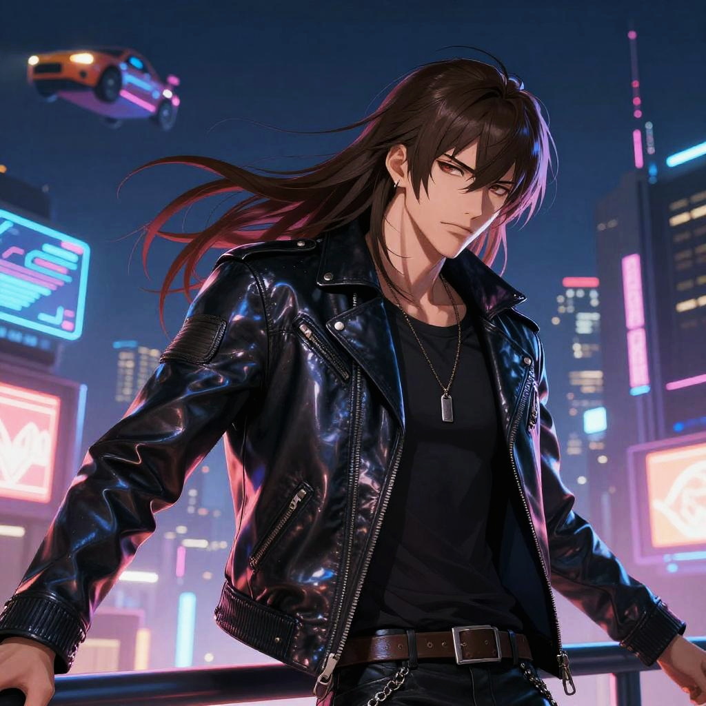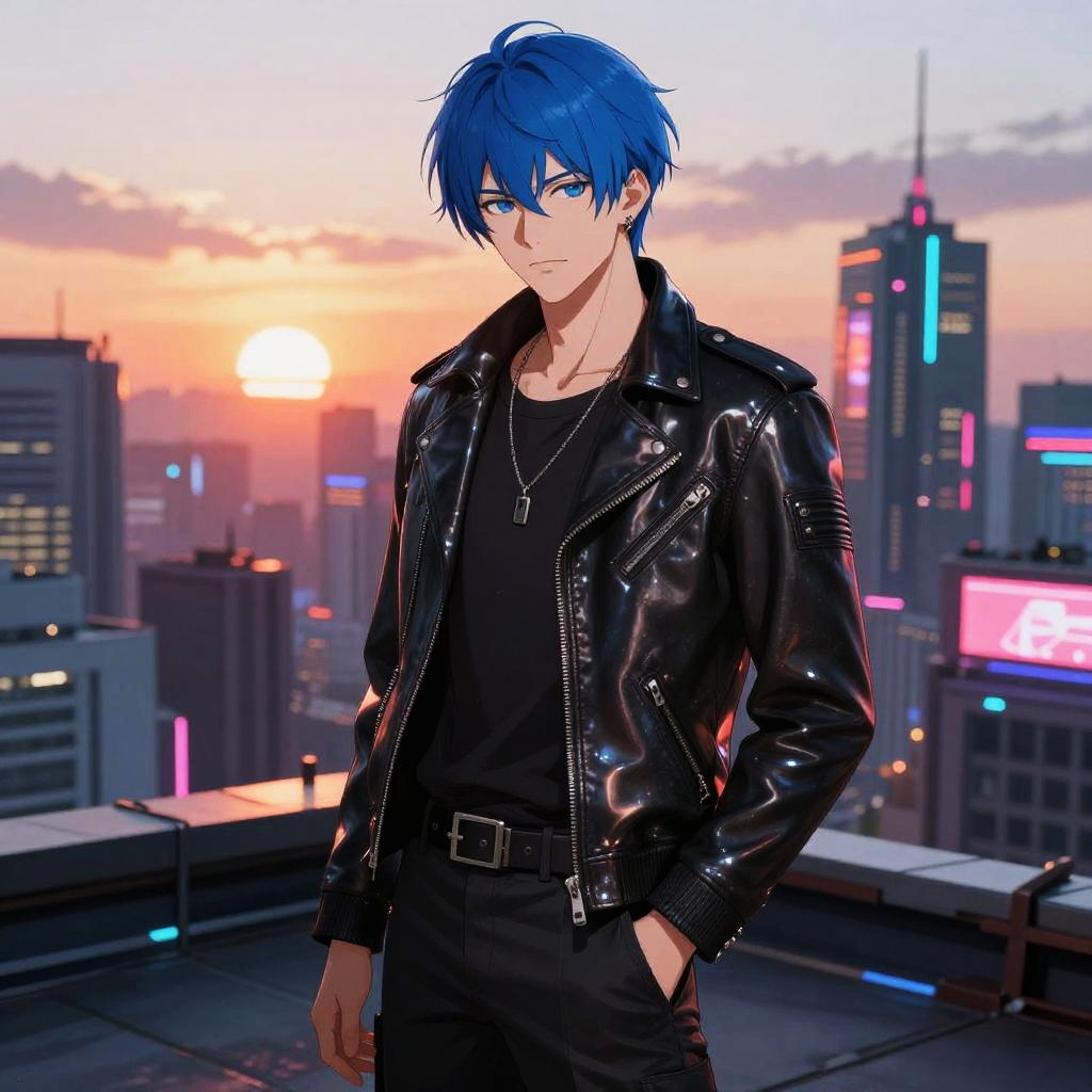 Anime boy with black hair and blue eyes standing in a futuristic cityscape at sunset, wearing a sleek leather jacket with neon lights reflecting on his face, detailed anime style, vibrant color palette, dynamic pose, cinematic lighting.