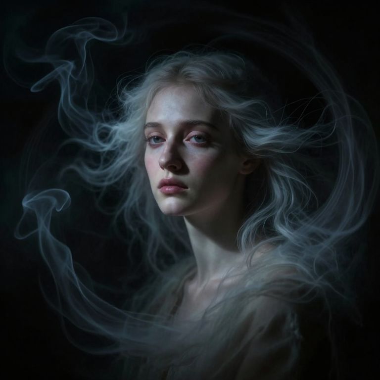 A digital painting depicts a pale-skinned, ethereal woman with long, flowing, white hair that swirls around her head in wisps of smoke. Her expression is serene, with delicate, pink-tinged cheeks and soft, blue eyes. She is set against a dark, almost black background, which contrasts with her luminous features and hair. The lighting is dramatic, highlighting her face and hair while leaving her shoulders and the background in shadow. The overall style is surreal and mystical, with a focus on ethereal beauty and fluid motion.