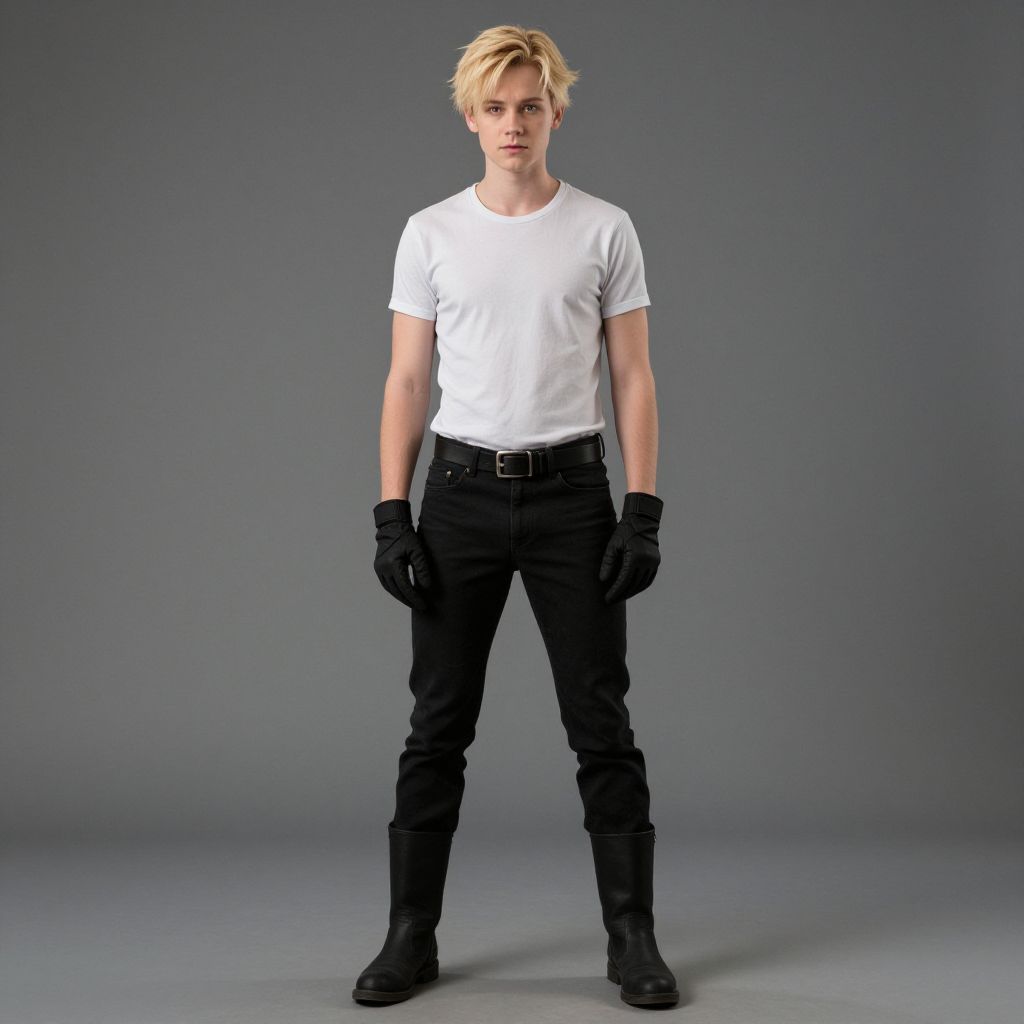 Photograph of a young, blond Caucasian man standing against a plain gray background. He has a slim build and wears a white, short-sleeved t-shirt, black fitted jeans, and black boots. He also has black gloves on both hands. His hair is slightly tousled, and he has a neutral expression. The lighting is even, highlighting his outfit and features. He stands with his feet shoulder-width apart, hands relaxed by his sides, exuding a casual yet confident demeanor. The overall style is modern and minimalist.