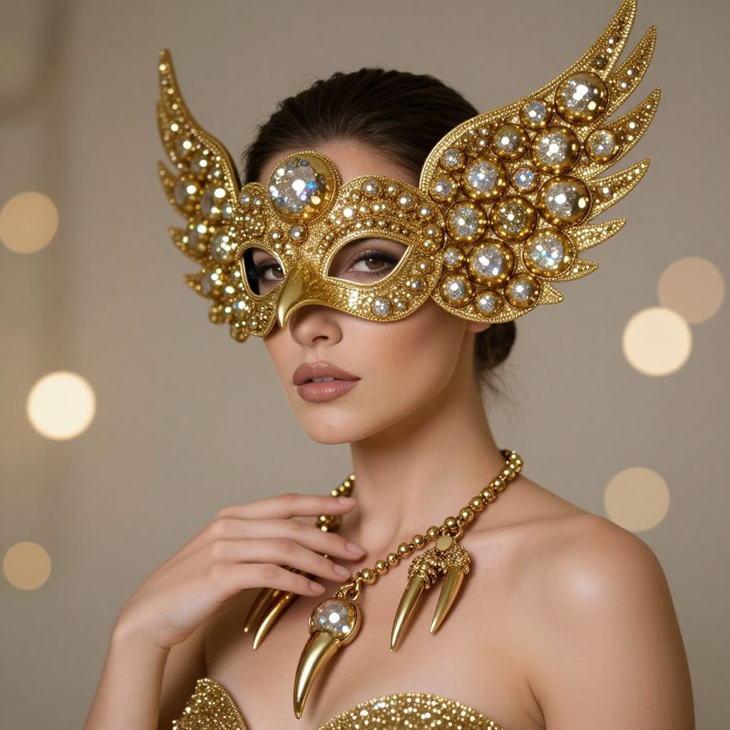 A woman adorned with a golden avian mask crafted from shimmering, metallic orbs and adorned with claw-like necklaces, stands against a bokeh-lit backdrop, embodying a surreal fusion of human grace and mechanical elegance.