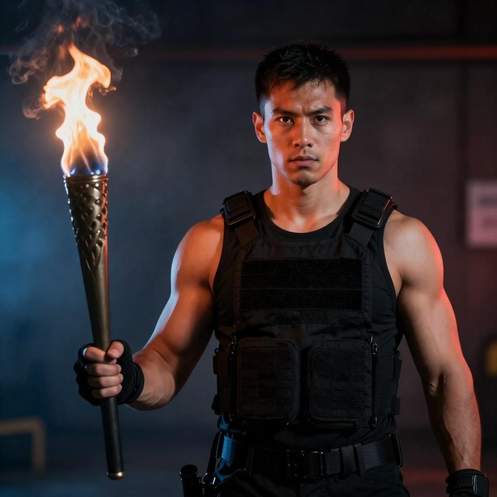 Photograph of a muscular man with short dark hair, holding a flaming torch in his right hand. He wears black tactical gear with multiple straps and buckles, illuminated by red and blue light. Smoke drifts in the dark, industrial background. His intense expression is focused forward.