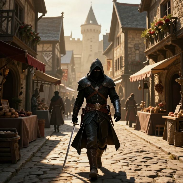 In a bustling medieval city teeming with political intrigue, a lone assassin strides through the narrow, cobblestone streets, cloaked in a hooded cloak and adorned with intricate armor. The scene is bathed in a warm, golden light filtering through the ancient buildings, casting long shadows and highlighting the textures of the worn stone and wooden structures. The assassin, with a mask covering their face, carries a sword at their side, exuding an air of danger and stealth. The cityscape is filled with various shops and stalls, their awnings and signs adding to the intricate details of the scene. The overall composition is dynamic, with the assassin positioned centrally, drawing the viewer's eye through the bustling cityscape, creating a sense of depth and movement. The interplay of light and shadow, combined with the rich textures and vibrant colors, creates a visually stunning and immersive fantasy art piece.