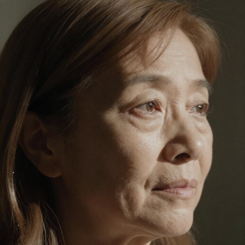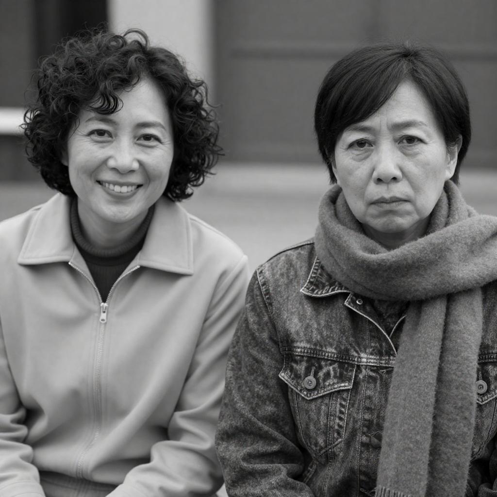 Black-and-white photograph of two people. Left: woman with short, dark, curly hair, smiling, wearing a light-colored jacket. Right: woman with short, dark hair, serious expression, wearing a denim jacket with a thick, ured scarf. Both seated, close together, blurred background.