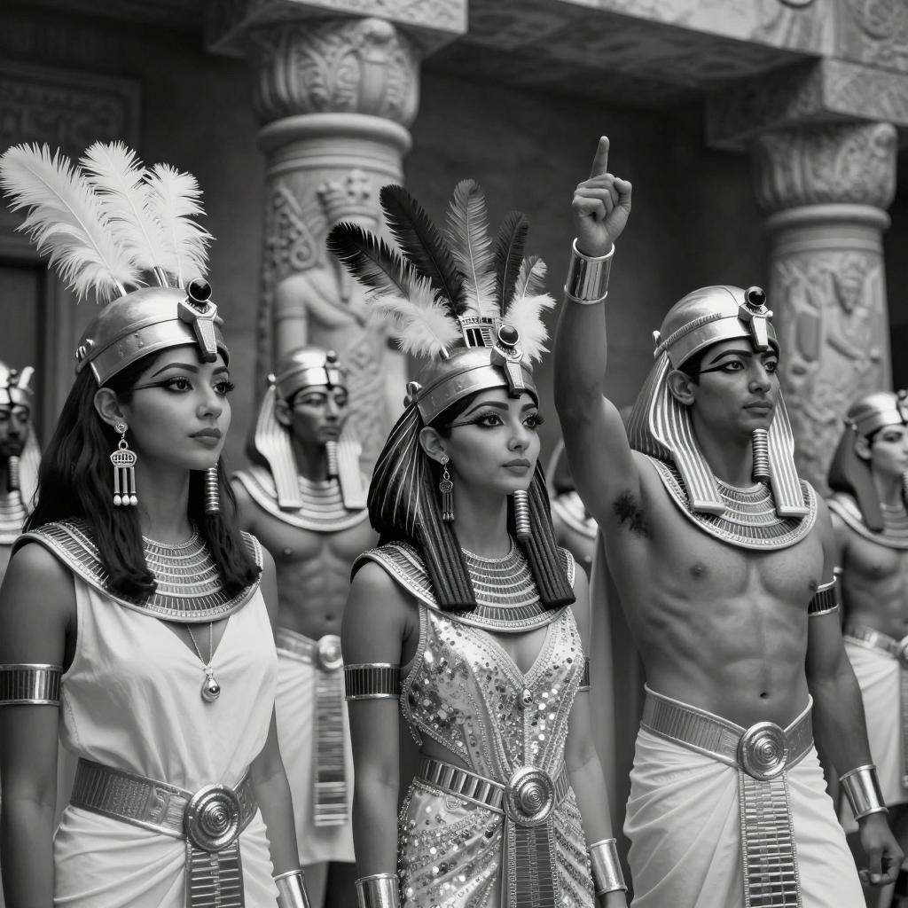 Black-and-white photograph of four people in ancient Egyptian-inspired costumes. Three men and one woman with elaborate headdresses, feathered headpieces, and sequined garments. Man on right raises arm, woman in center wears headdress with feathers, men wear ornate helmets. Background includes stone pillars and Egyptian statues. Woman on left looks to the side, woman in center has intense expression, men appear focused. Indoor setting with dramatic lighting.