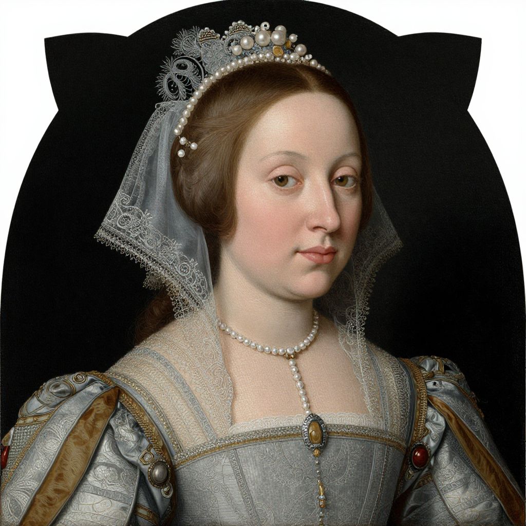 Renaissance-style portrait of a pale-skinned woman with dark brown hair, wearing a silver gown, pearl necklace, and jeweled brooch,