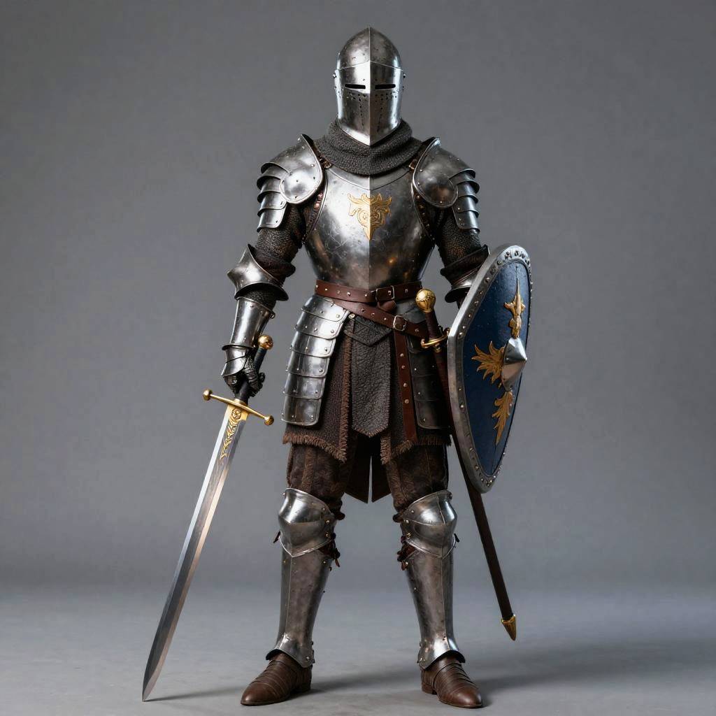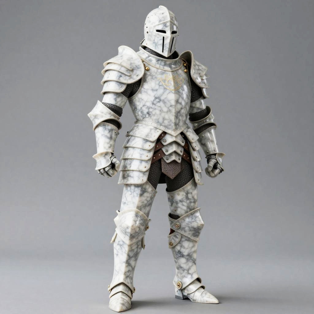 Photorealistic CGI of a medieval knight in full silver marble-patterned plate armor, standing with a neutral gray background.