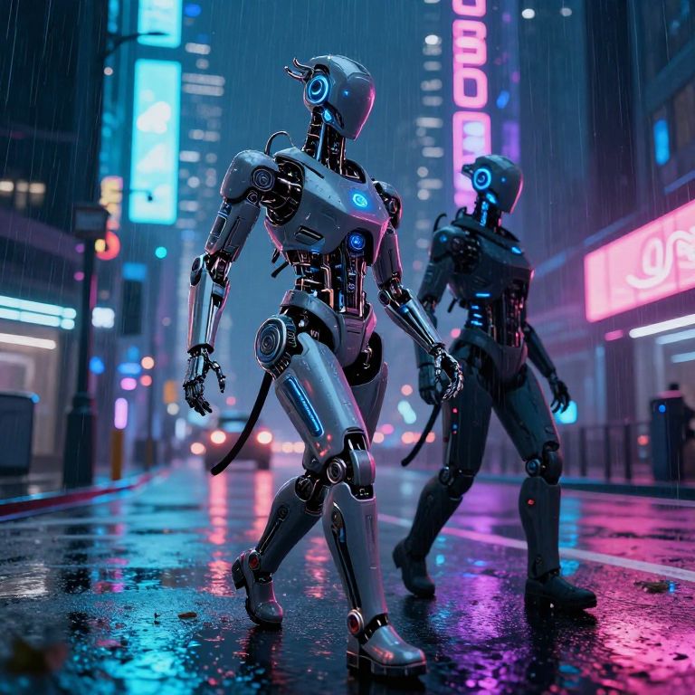 Futuristic bгєfalos with biomechanical features roaming a neon-lit urban landscape at night, cyberpunk aesthetics, glowing accents, rain-soaked streets, high contrast and vibrant color palette