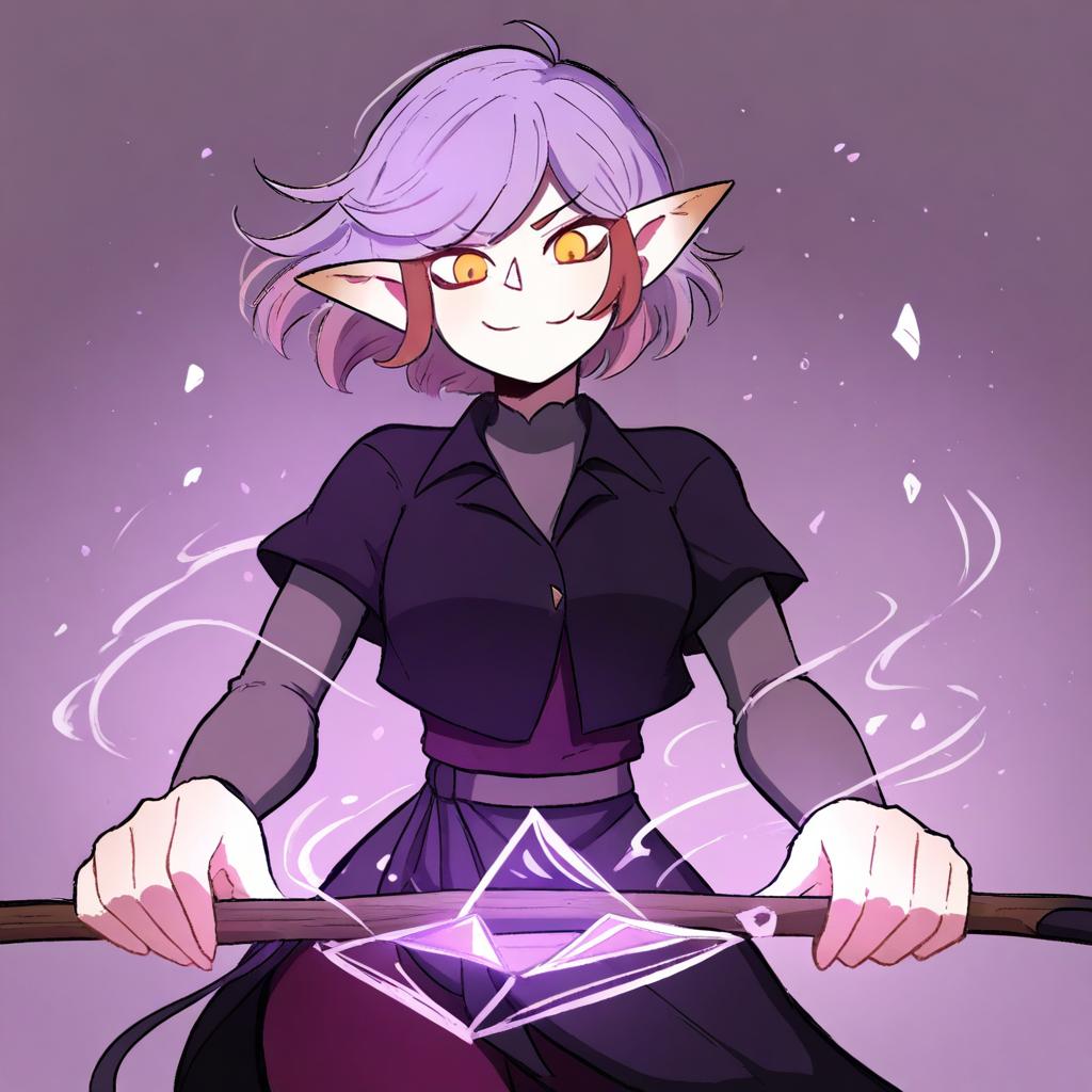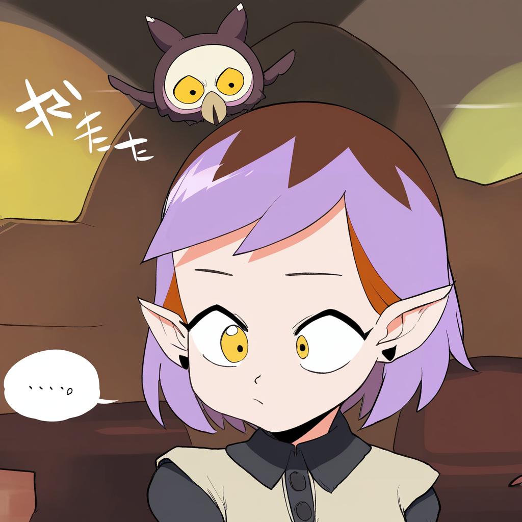Amity blight, the owl house, 1girl, pointy ears, yellow eyes, purple hair, short hair, brown hair, by artist kaiman garupan, animagine