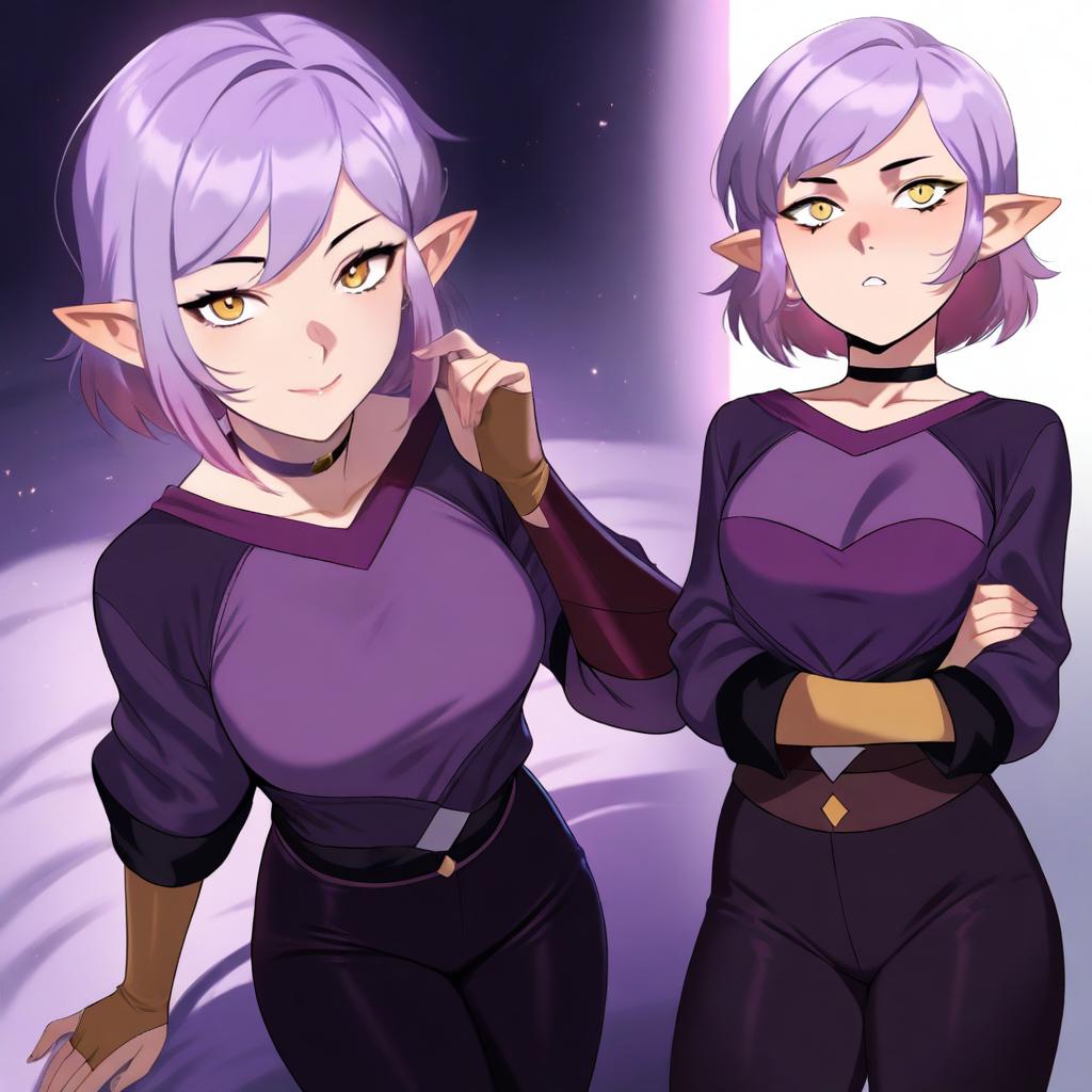Digital anime-style illustration of a young elf girl with pointy ears and yellow eyes. She has short purple and brown hair, a slightly blushing face, and is wearing a dark top with a choker. The background features a purple glowing gradient with dark accents.