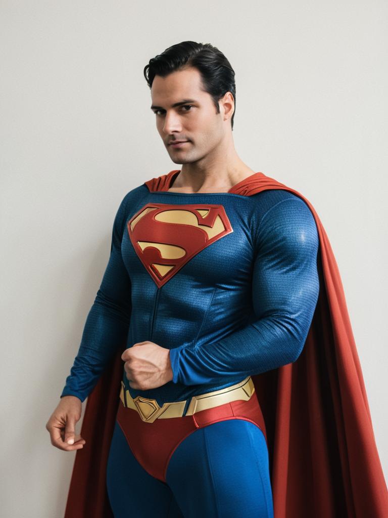 Man cosplay. Wearing Superman costume. Realistic photo. Dressed as Superman --sref 1400