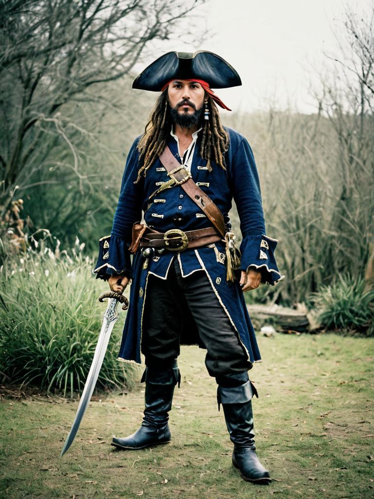 Full body portrait of a man dressed in a detailed pirate costume standing outdoors on grass with bare trees in the background. The costume includes a dark blue long coat with gold trim, black boots, black pants, and a tricorn pirate hat. The man has long dreadlocked hair, a beard, and wears a red headband. He is holding a curved sword and has a leather belt and sheath.