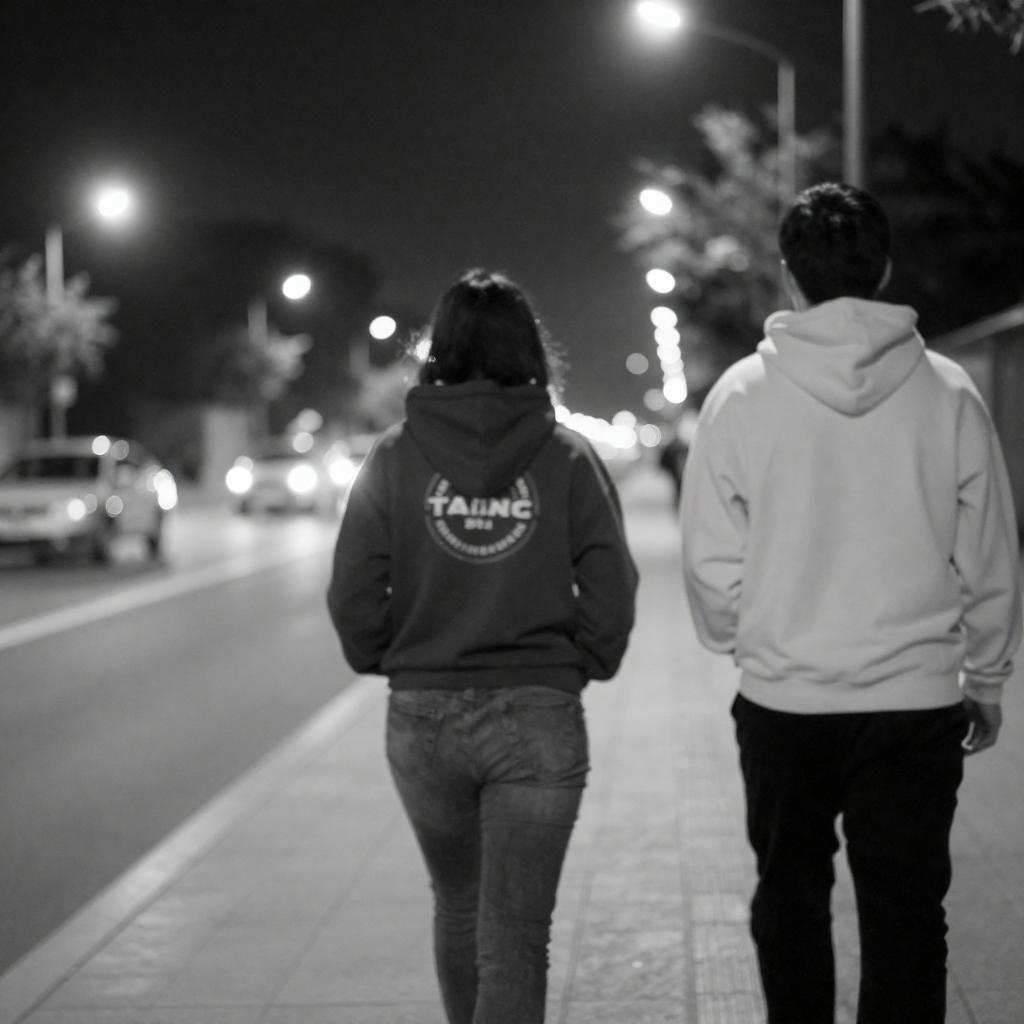 This black-and-white photograph captures a nighttime street scene with two people walking away from the camera. The person on the left wears a dark hoodie with a visible logo and jeans, while the person on the right sports a light-colored hoodie and dark pants. Bright streetlights create a glowing effect in the background, and blurred car lights add motion to the scene. The image has a slightly blurry, grainy texture.