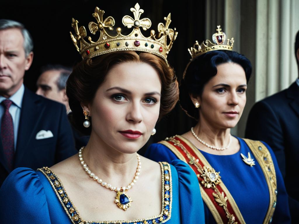 Royal Costume Adults face swap, a close up of a woman in a blue dress and a gold crown