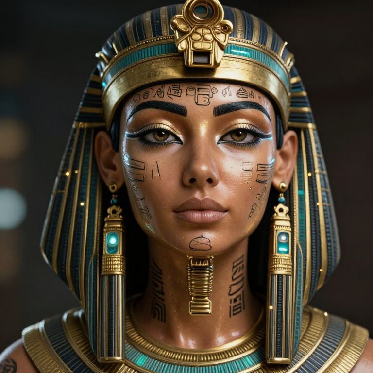 Photorealistic digital portrait of an ancient Egyptian woman with dark skin, gold and turquoise headdress, detailed hieroglyphs on face, glowing blue