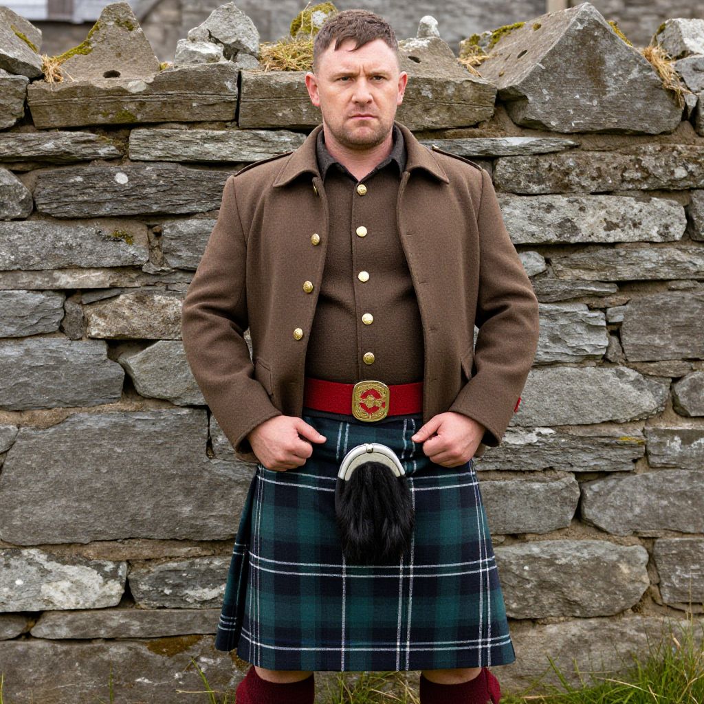 A man wearing a kilt with a plaid skirt, a brown coat with gold buttons, and a red belt, standing in front of a stone wall with his hands in his pockets. The man has a strong, rugged appearance with a confident posture, emphasizing his rugged charm and traditional Scottish attire. The scene is set in a rustic, outdoor environment, highlighting the authenticity and historical feel of the clothing and setting.