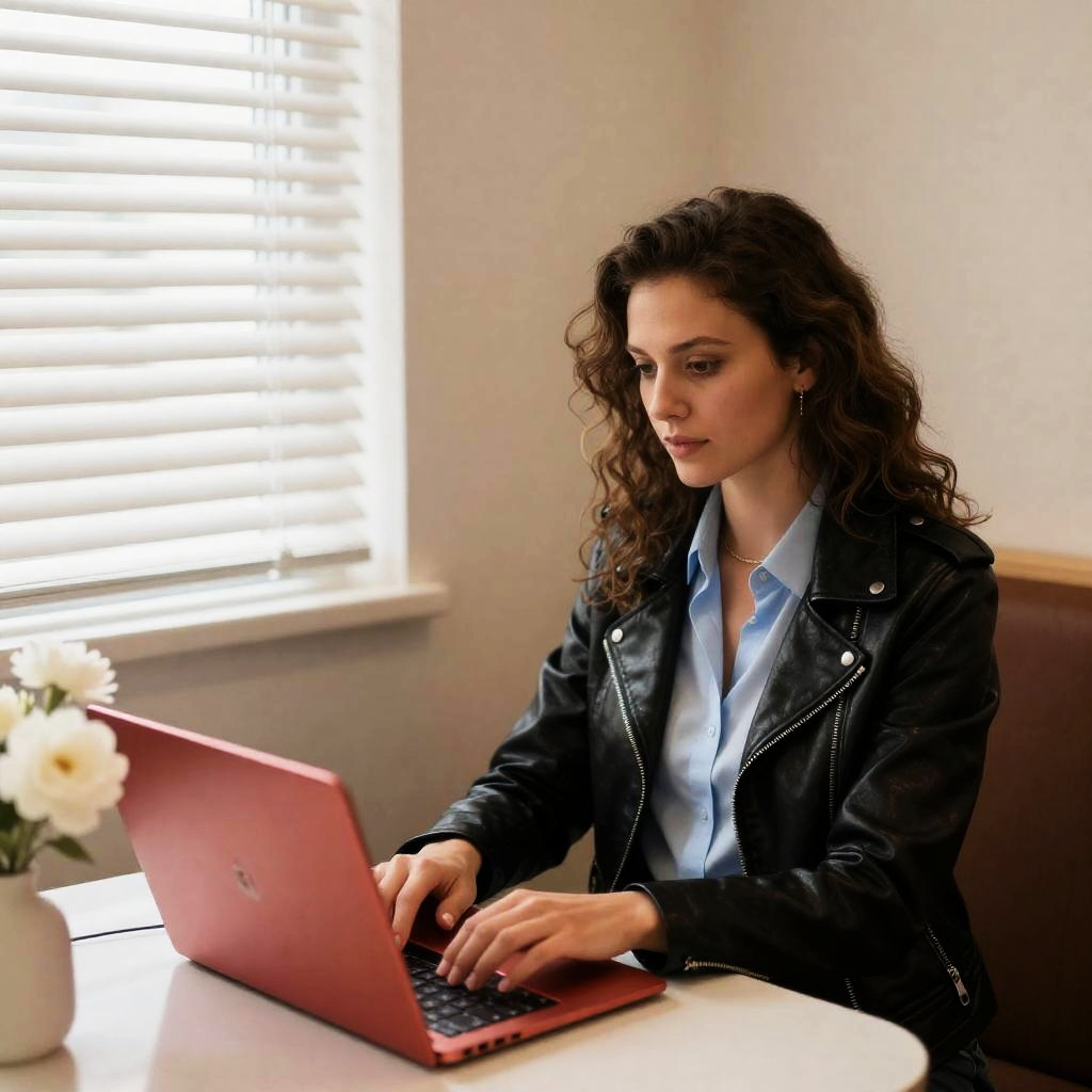 Woman with wavy brown hair in black leather jacket and light blue shirt, typing on red laptop in brown booth. White blinds on window, vase with white flowers on table. Right arm extended, focused expression. Light brown walls.