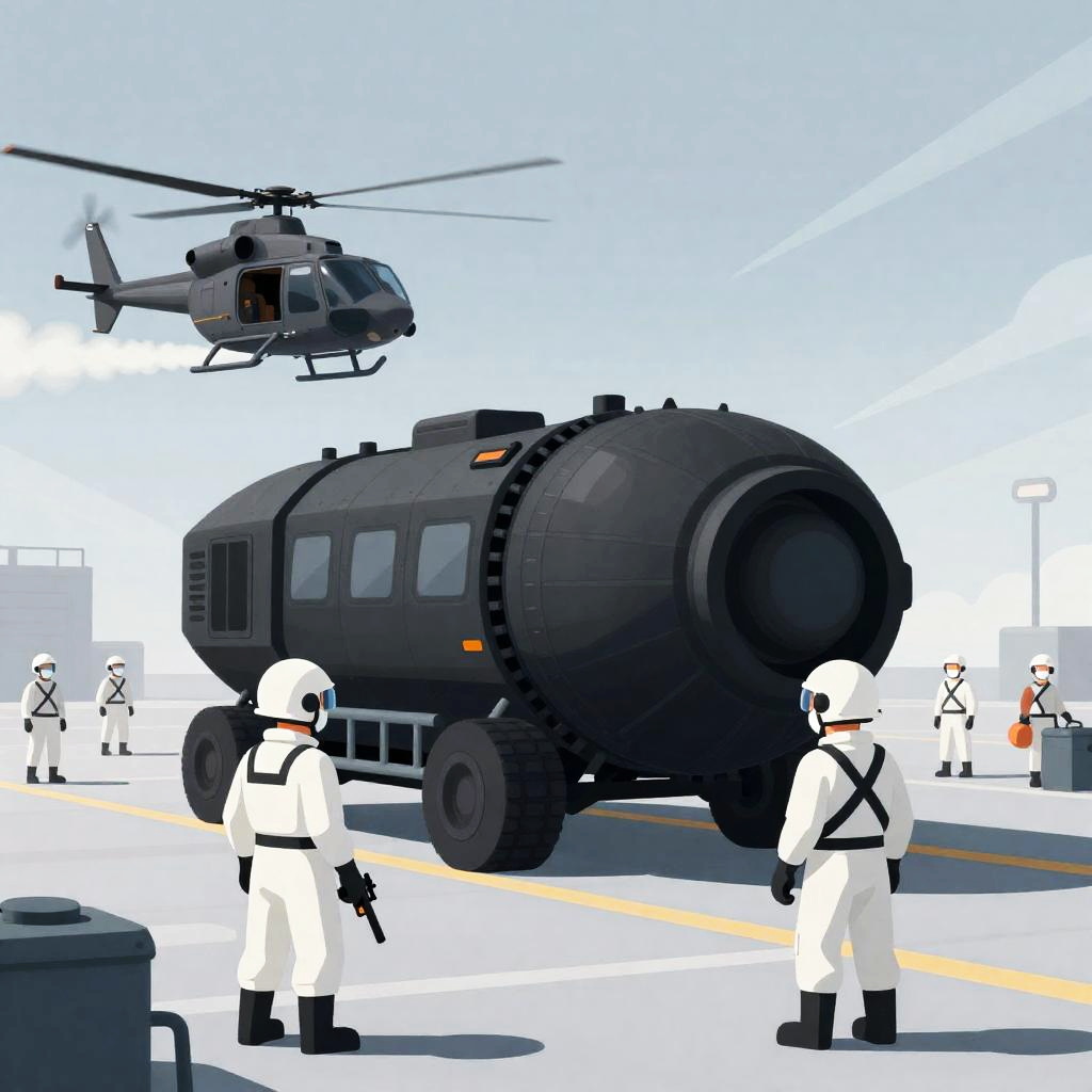 Illustration of a busy spaceport. Large, black, industrial transport vehicle in the center, surrounded by several white-clad workers with helmets and masks. One worker in the foreground holds a gun. Helicopter in the sky, trailing a white exhaust. Multiple workers in the background, some carrying equipment. Striped barrier in front of the vehicle. Overcast sky with light beams.