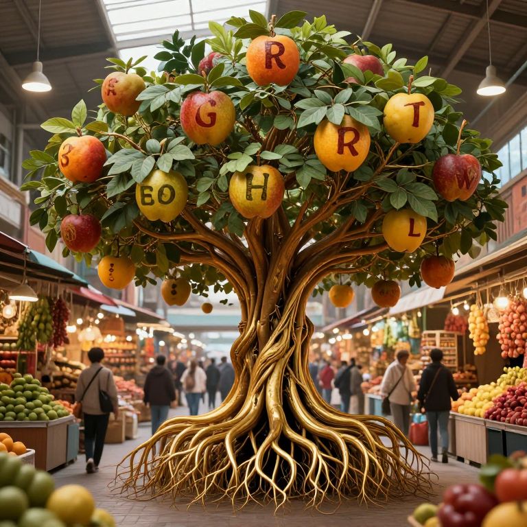 Photograph of a market tree with large apples labeled "R", "G", "E", "T", "H" in yellow, surrounded by