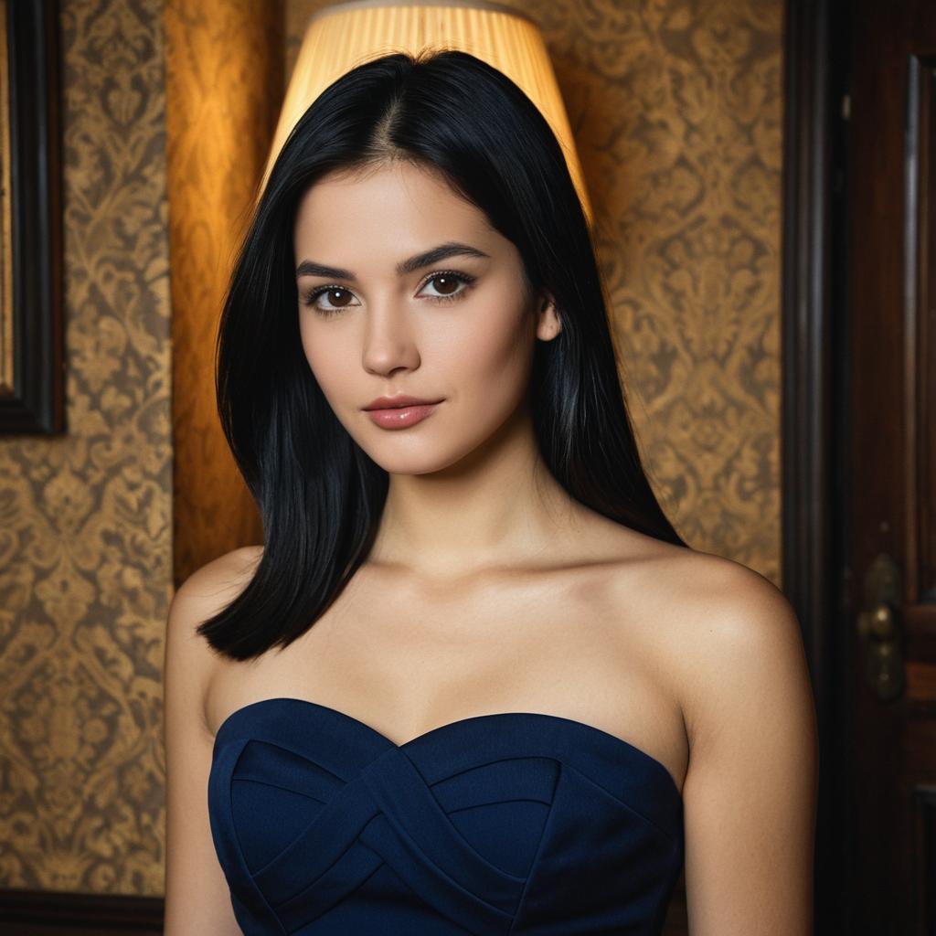 A realistic portrait of a young woman with medium-length straight black hair and striking eyes, wearing a strapless navy blue evening dress, bright overhead lighting accentuating smooth skin texture, warm brown and beige colors, detailed facial features, traditional antique interior background