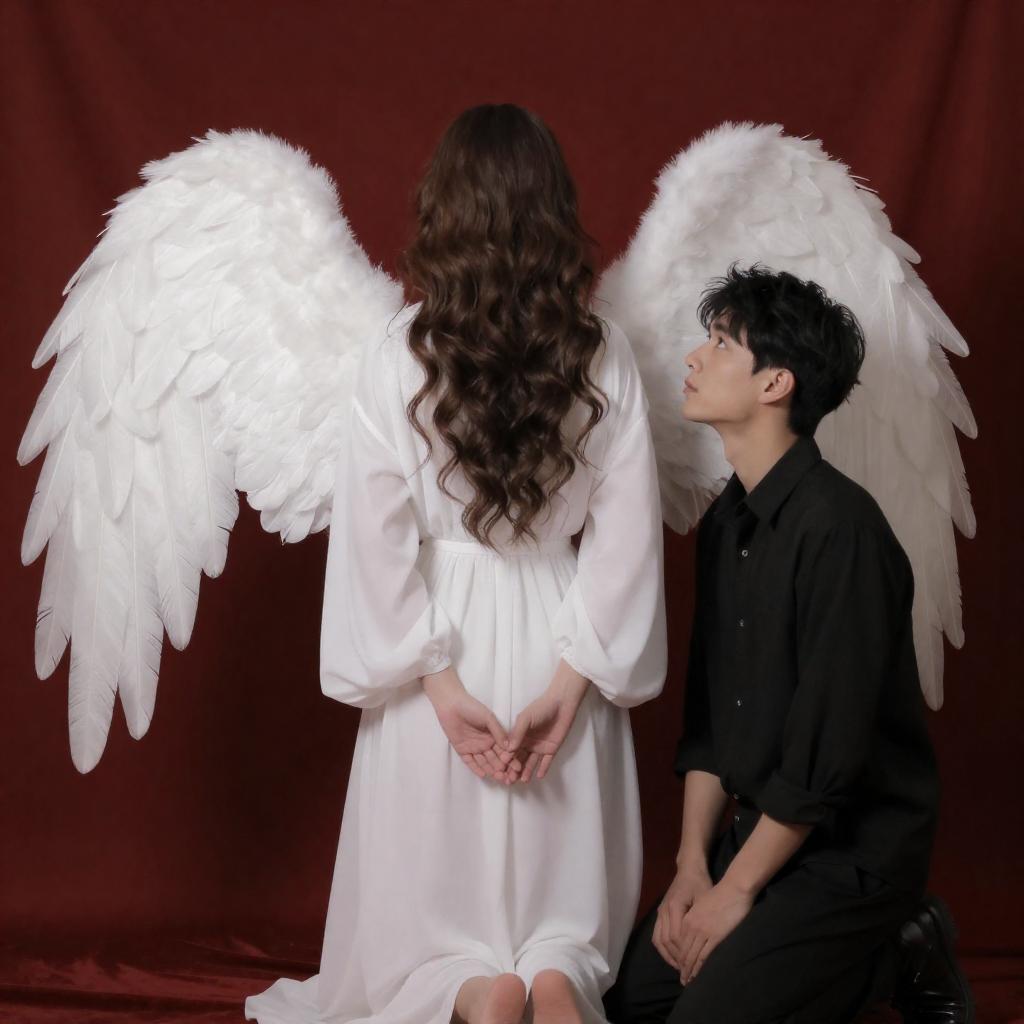 Photograph of a man kneeling and a woman with white angel wings in a flowing white robe. Red curtain background. Woman's back to camera, man looks up at her. Soft lighting. Woman's hair wavy, man's hair dark. Angel wings white and feathery. Man's hands clasped. Intense gaze from man.