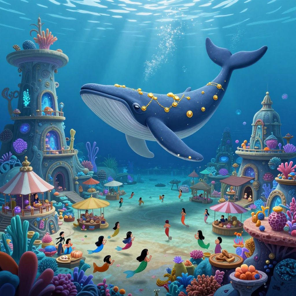 Visualize an enchanting underwater metropolis reminiscent of classic Disney animation, with bioluminescent marine life intertwining among the intricate coral formations. A regal whale, adorned with golden trinkets evoking the grandeur of Poseidon himself, glides elegantly above a lively marketplace teeming with merpeople. This bird's-eye view panorama showcases both the magnificence and coziness of this aquatic society, encapsulating an array of feelings from awe to serenity as sunlight pierces through the azure depths.