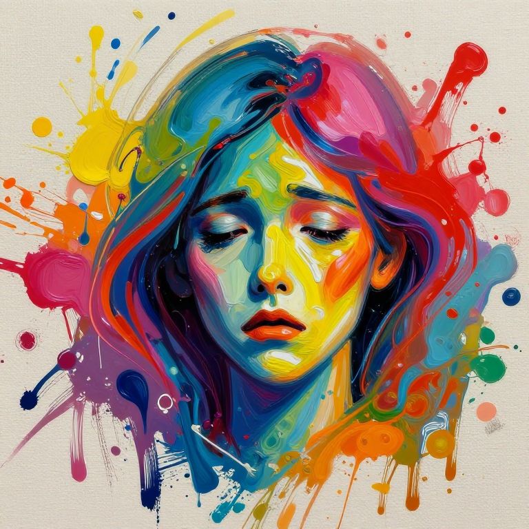 Vibrant digital painting of a sorrowful woman with closed eyes, colorful splashes of red, blue, yellow, and green paint surrounding her face