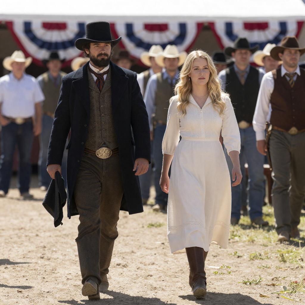 Four people dressed in vintage western attire are gathered in an ornate, warmly lit room with patterned wallpaper and vintage lamps. Two men wear cowboy hats; one in a green shirt and the other in a white shirt with a brown vest and mustache. Two women, one with blonde hair in a blue dress and the other with dark curly hair in a white dress, are engaged in conversation near a marble-topped wooden counter.
