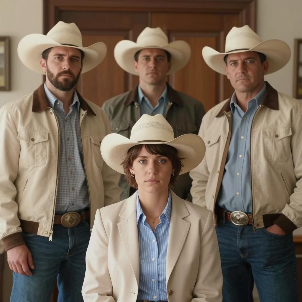 Photograph of four people in an ornate room. A man in a cowboy hat and vest leans on a counter, mustache visible. A woman in a white dress sits on the counter, smiling. A blonde woman in a blue dress touches her neck, looking at the man. Another man in a green shirt and hat stands to the left. Warm, patterned wallpaper and vintage lamps in the background.