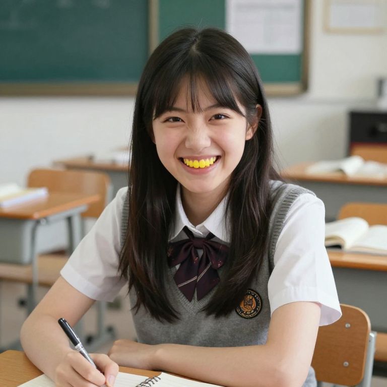 Girl with yellow teeth in school uniform, awkward smile, cluttered classroom setting, realistic lighting with slight film grain effect
