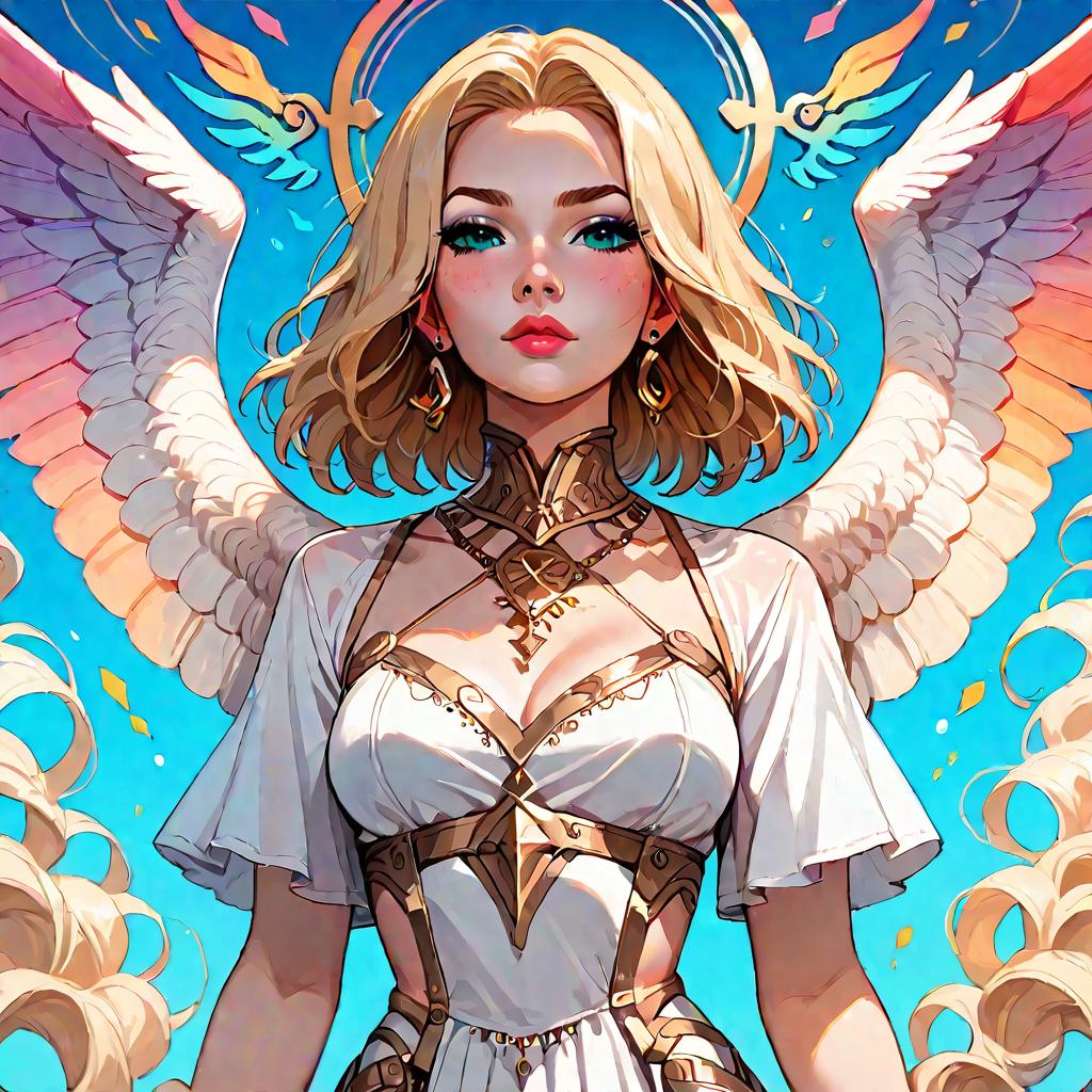 Digital artwork of a beautiful angelic girl with long blonde hair, white robe with blue trim, and large white wings. She is surrounded by glowing stars and a magical halo, symbolizing enlightenment and transfiguration in a celestial night sky background.