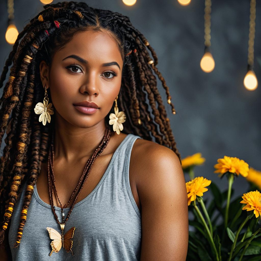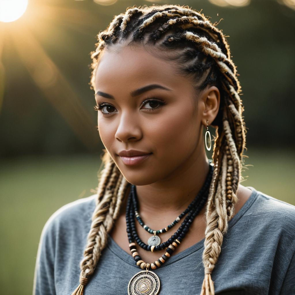 Photorealistic close-up portrait of a young Black woman with intricate blonde faux locs braids. She wears natural makeup and a subtle smile, dressed in a gray long-sleeve shirt. She accessorizes with multiple layered beaded necklaces featuring a circular pendant and oval hoop earrings. The image is taken outdoors with warm sunlight creating a soft glow and a blurred bokeh background.
