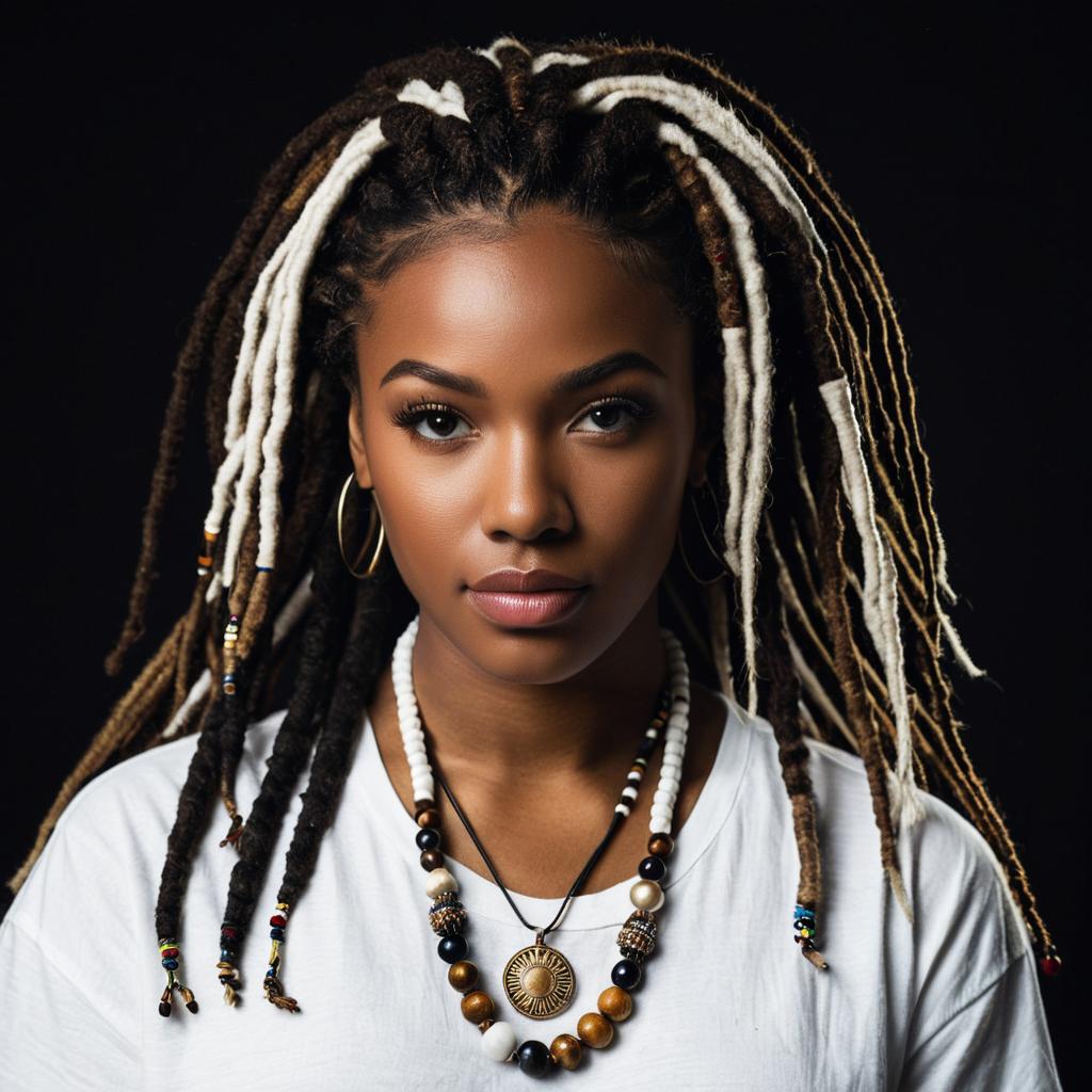 Faux locs braids blonde, photorealistic portrait, young black woman, long blonde dreadlocks, intricate braided style, natural makeup, neutral expression, wearing multiple layered beaded necklaces, circular pendant, gray long-sleeve shirt, bokeh blurred background, warm sunlight, detailed hair ure, soft lighting, close-up, realistic shading, realistic hair detail, confident gaze, subtle smile, outdoor setting