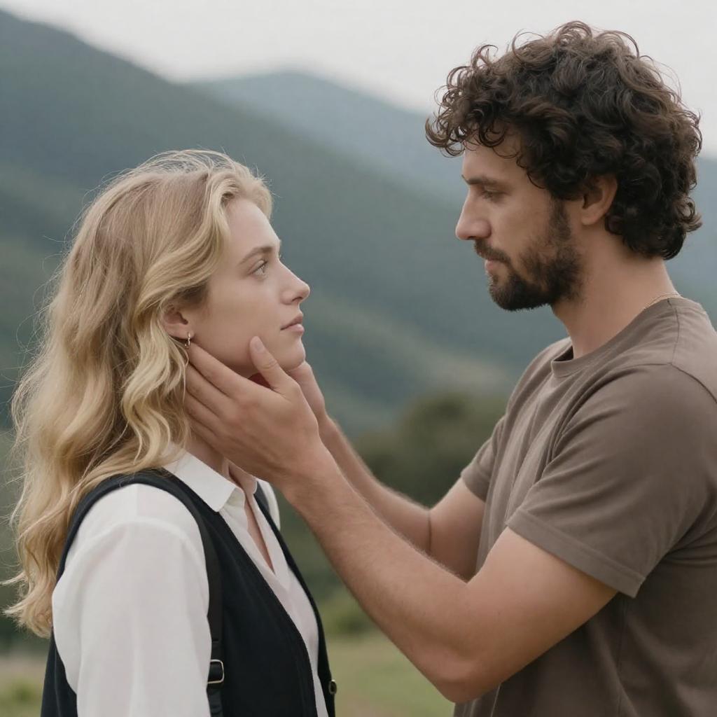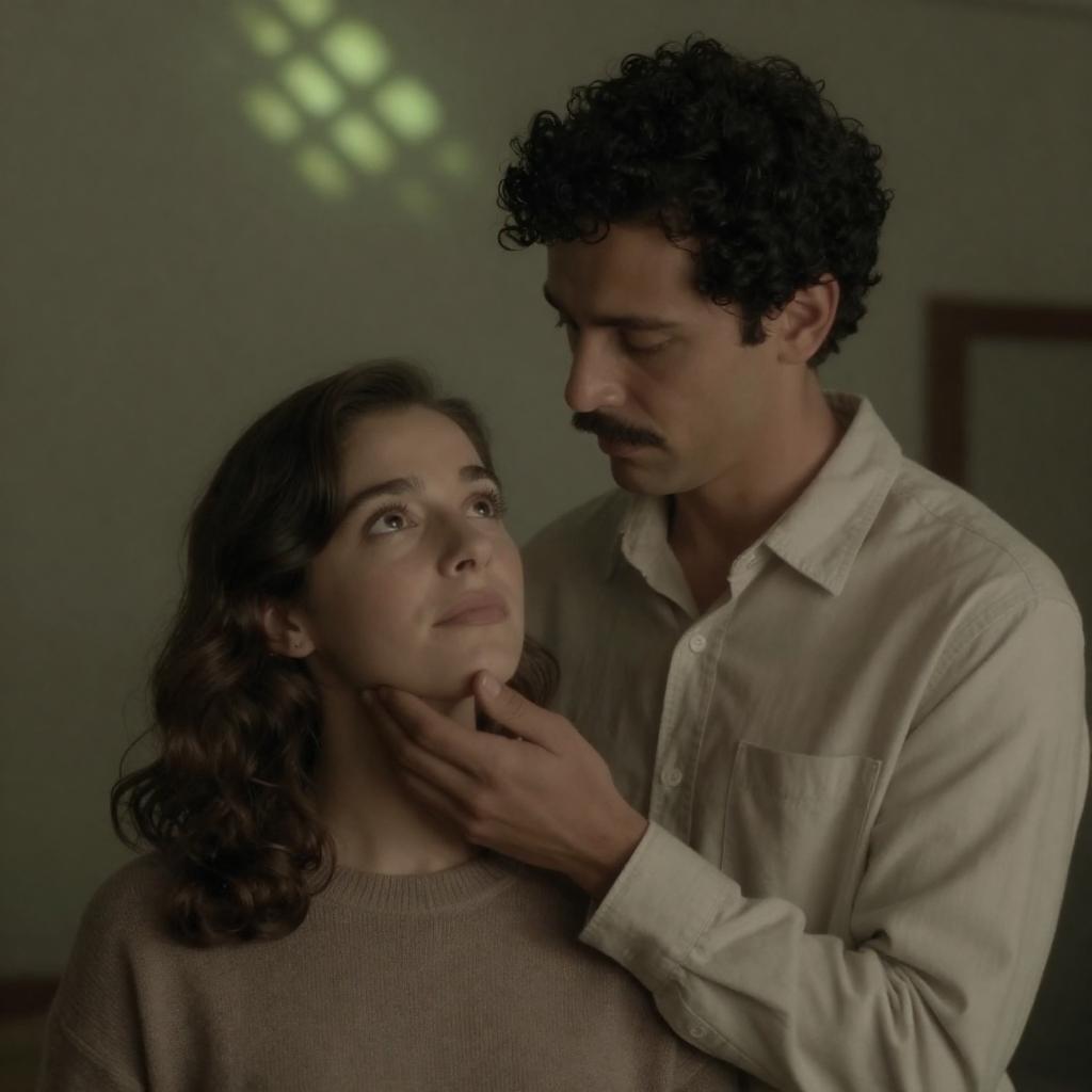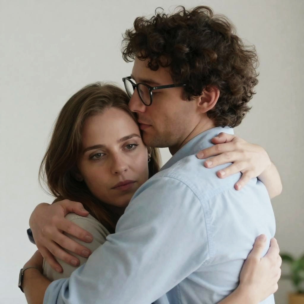 Photograph of two people hugging. Man with curly brown hair, glasses, light blue shirt, closed eyes, nose buried in woman's shoulder. Woman with light brown hair, fair skin, serious expression, visible from side, embracing man from behind. Indoor setting.