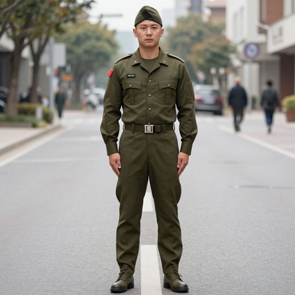 Photograph of an Asian male soldier in olive green uniform, standing on a blurred urban street, with trees and pedestrians in the background.